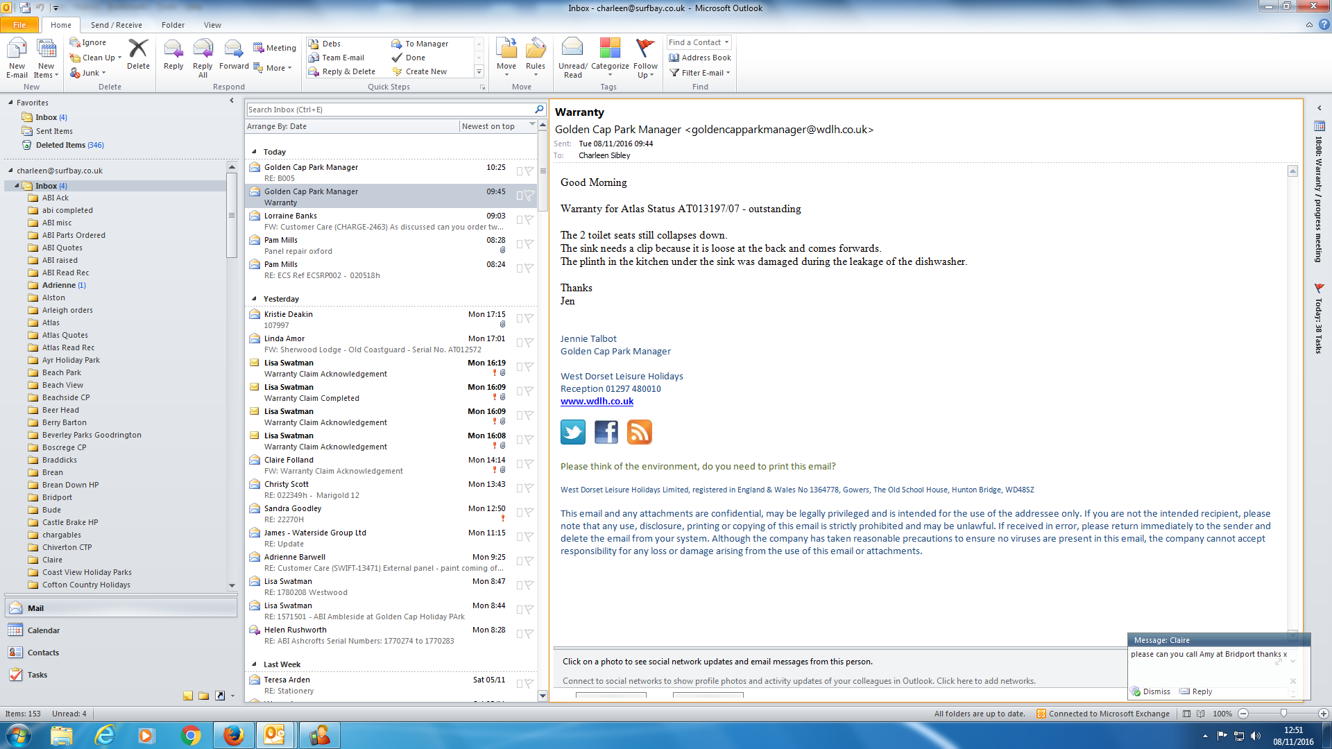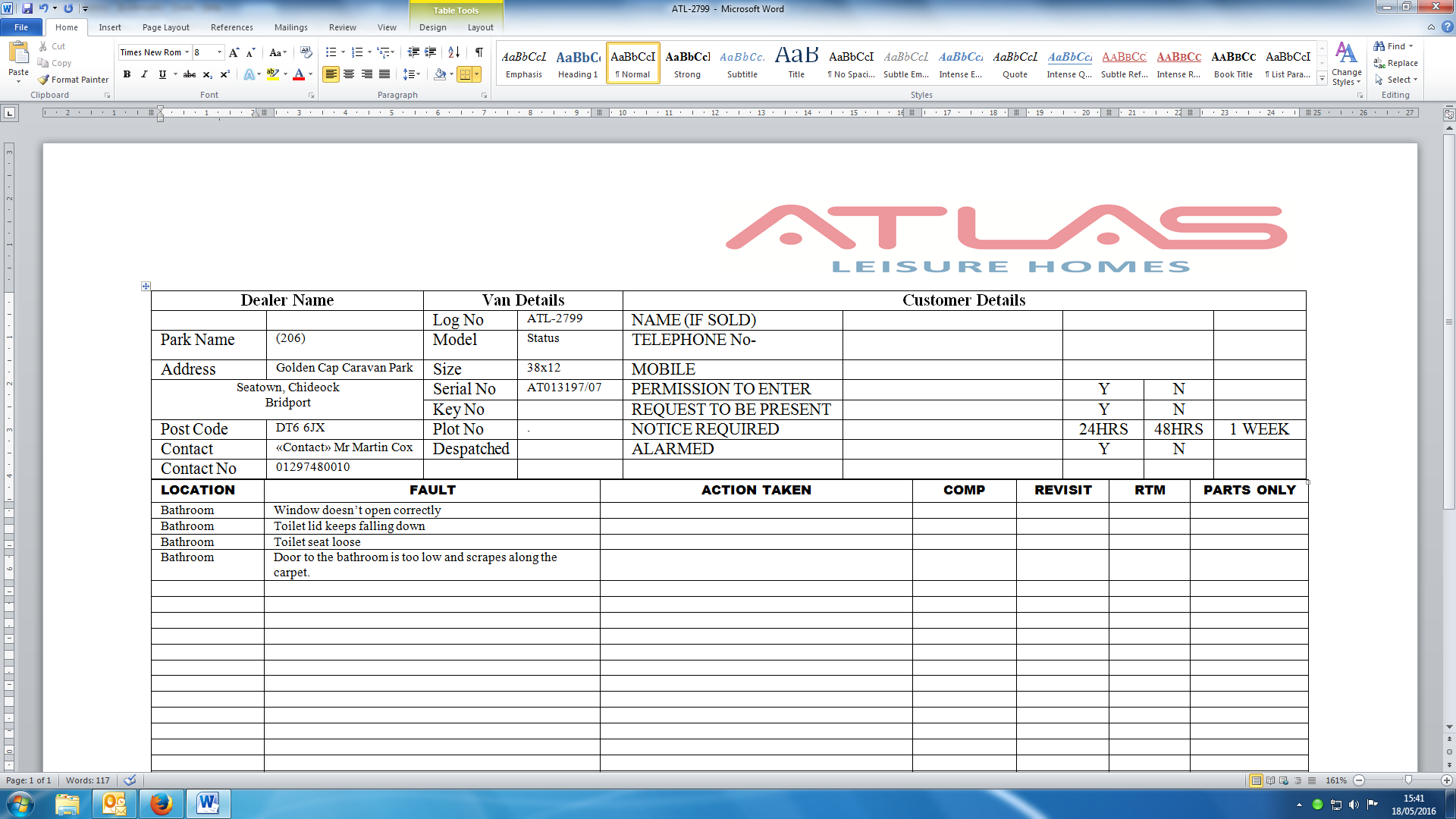 Claire Folland added a comment - Jen from the park has phoned to advise her customers are very unhappy with the service, they have been waiting for a while for things to be sorted but have not heard anything from Atlas, phoned Atlas and spoke to Racheal, she does not have this on her system,