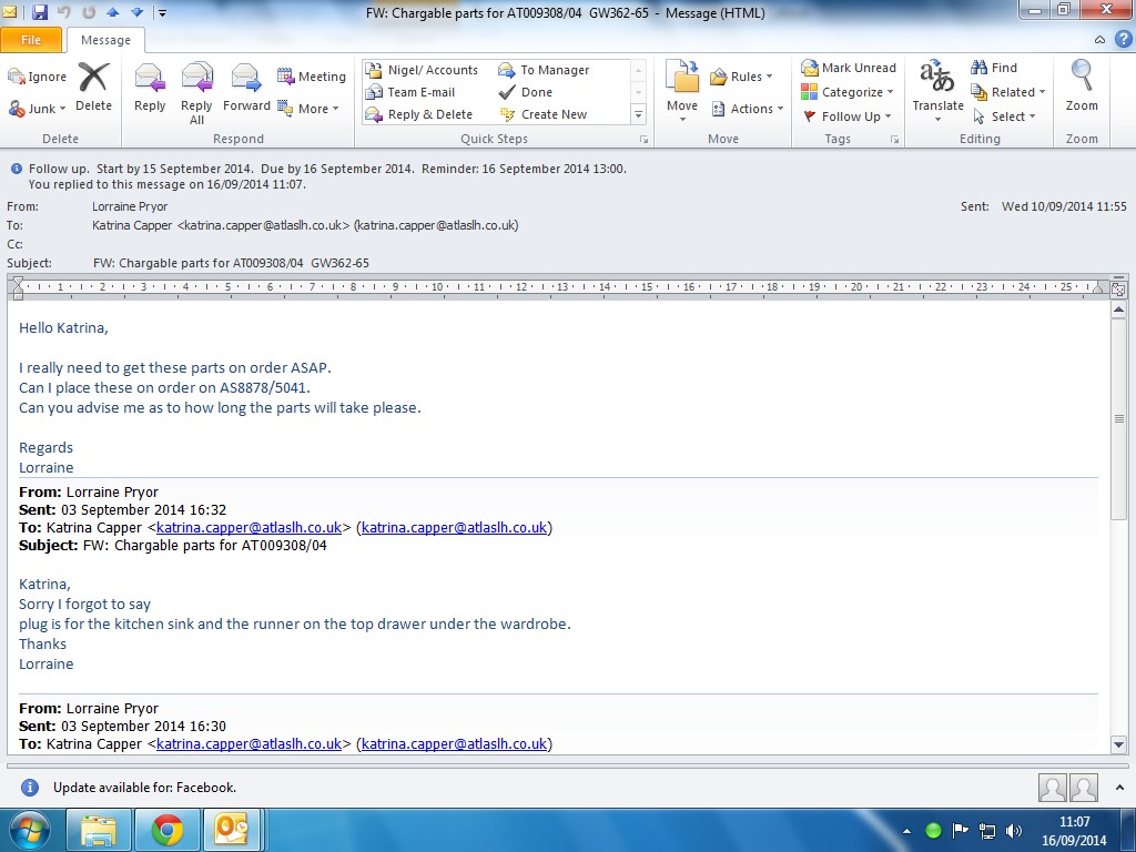 Lorraine Pryor (Inactive) added a comment - Tim called to chase these issue up and see if parts are in. I have advise him that the parts are in and we are waiting to send our engineer out to fit the parts. Spoken to ade and she has written this on her board for us to attend next week, I have advise Tim that it will be next week but I can tell him the day until friday when the scheduling is done. I have put a note on the work sheet to say we need to call tim to say which day we are going .