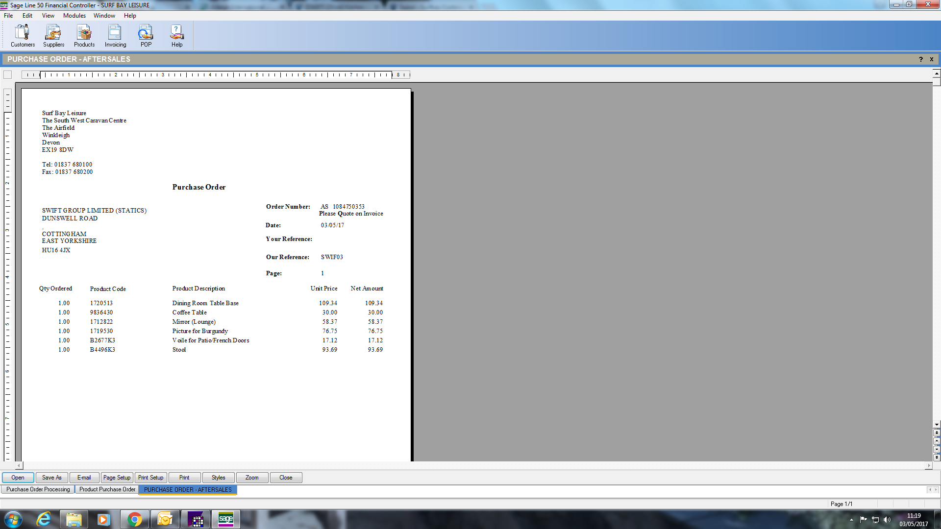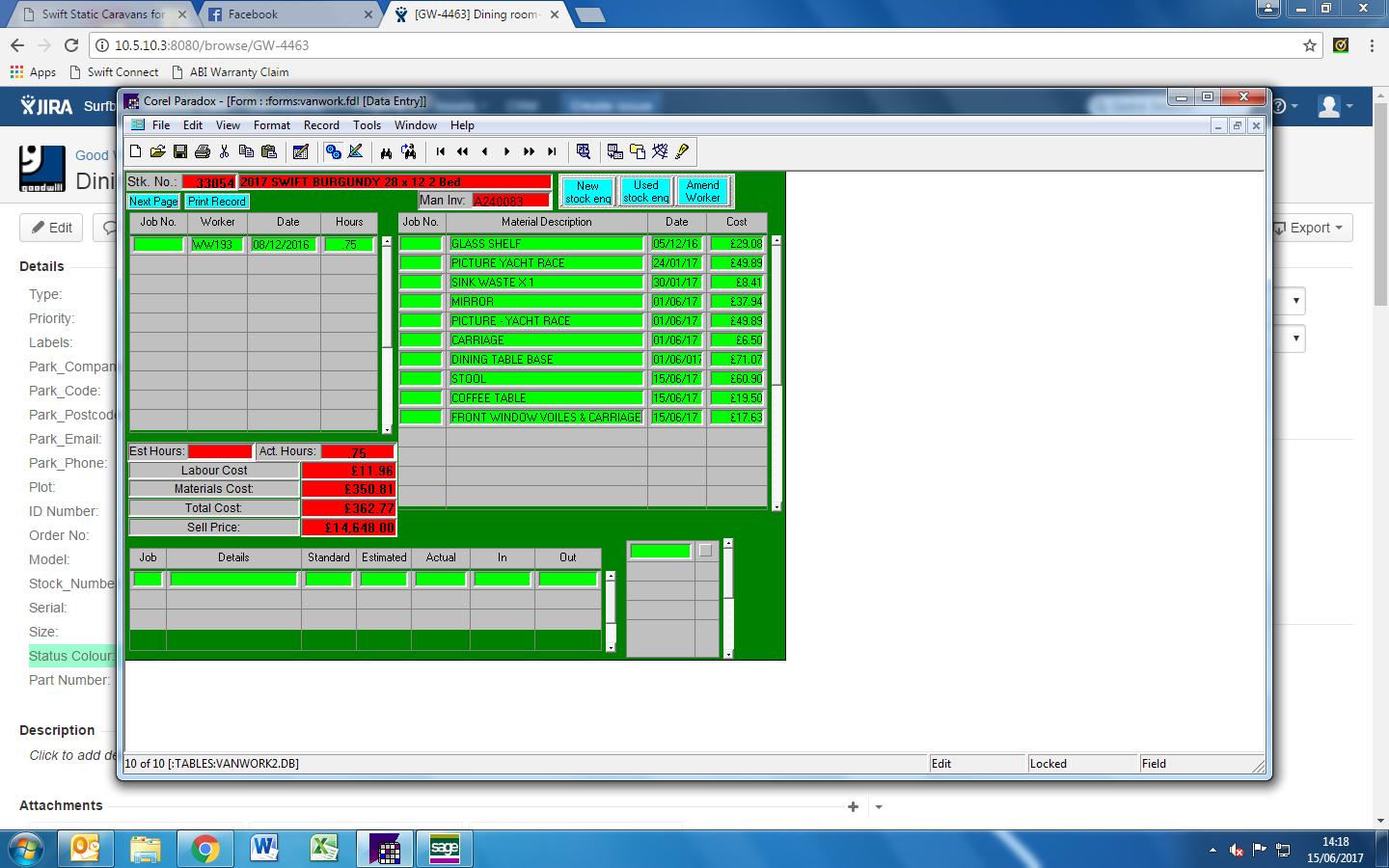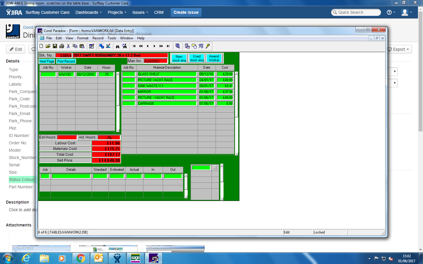 Isabel Smith (Inactive) added a comment - I didn't put the screen shots on this issue. This looks like the way we have to pay for parts after they come into us which is not something that I have ever done before. I have checked with Claire to find out if we have received the replacement table because there has never been a worksheet issued for this claim. According to Swift the part was dispatched on the 22/05/17 so not sure what has happened. Claire is going to speak to Steve and see if we can polish up one that we have got and if not then speak to Swift to find out where the part has gone and if we need to order a new one.