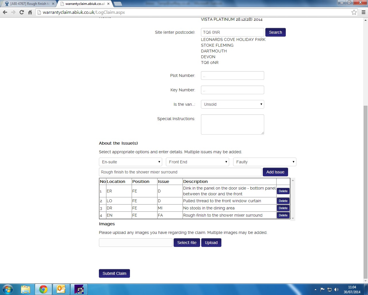 Warranty acknowledgement received 08.04.14 - this was rejected by ABI as this was transport damage