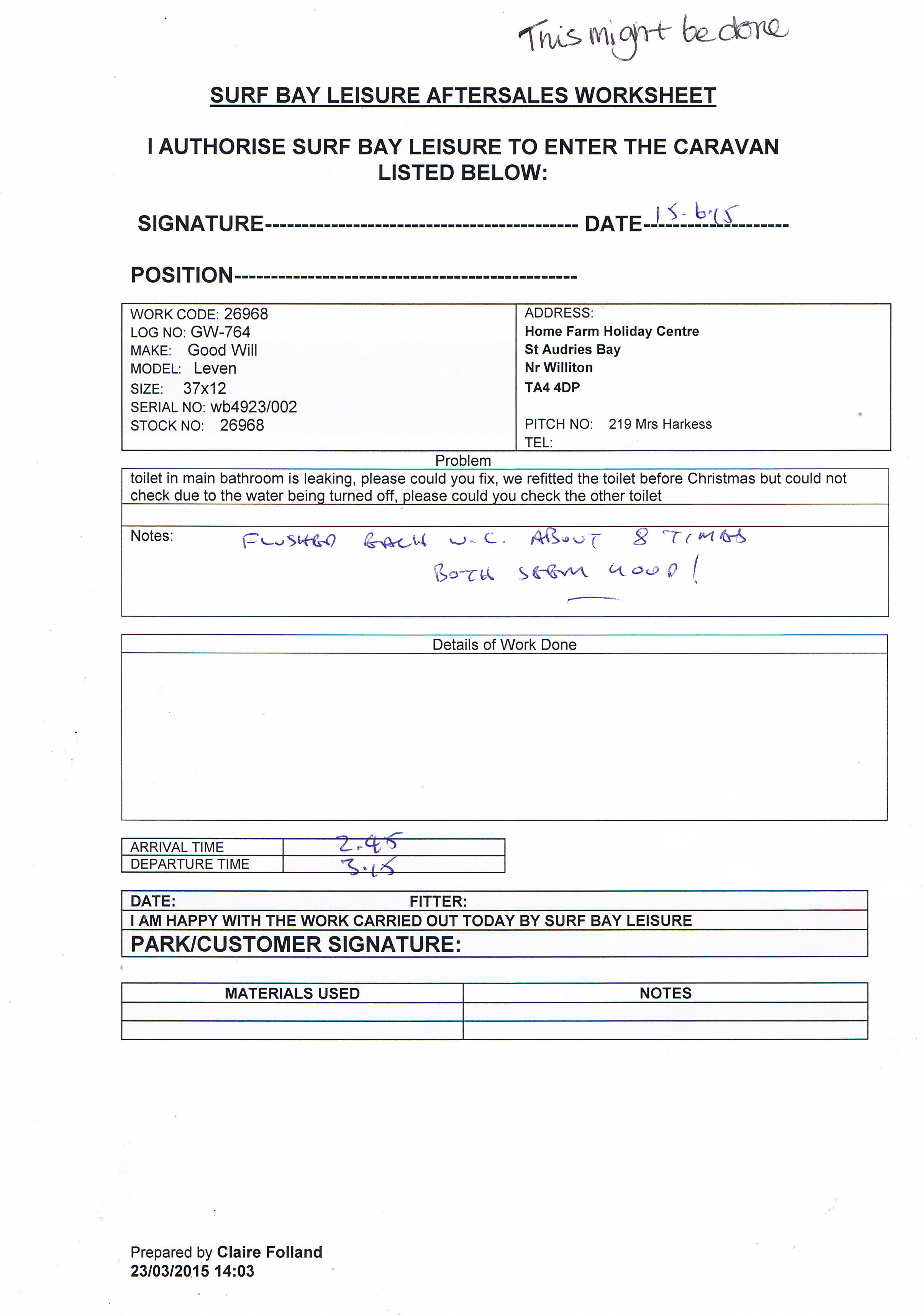 Claire Folland added a comment - Keith attended 15-6-15, flushed both about 8 times both seem good