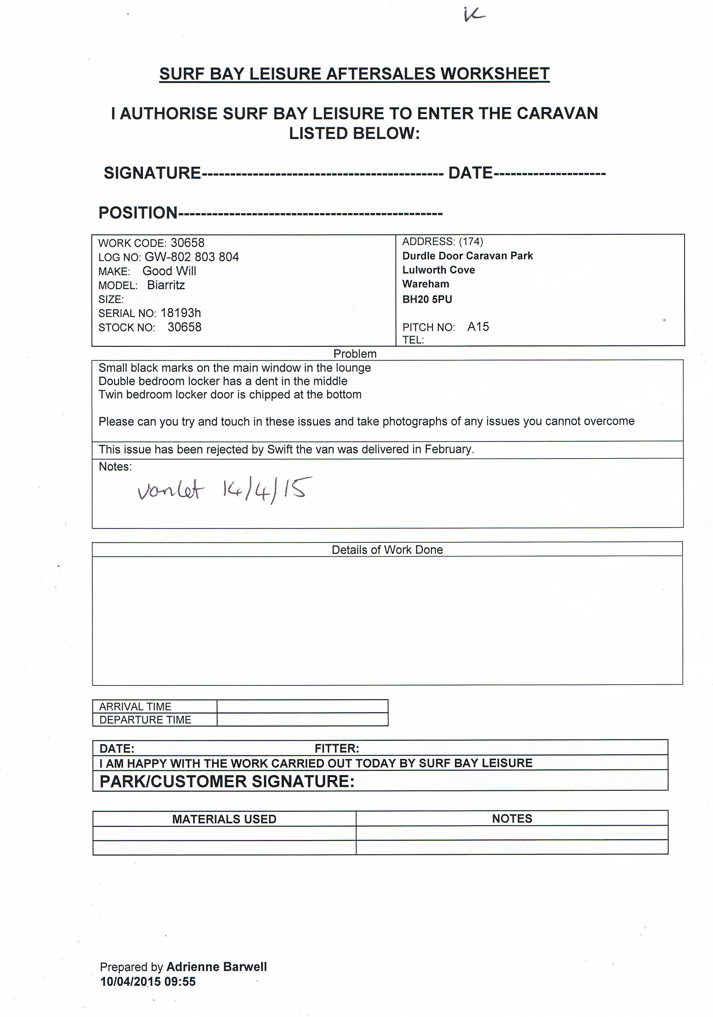 | Description | This issue has been rejected by Swift the van was delivered in February. |