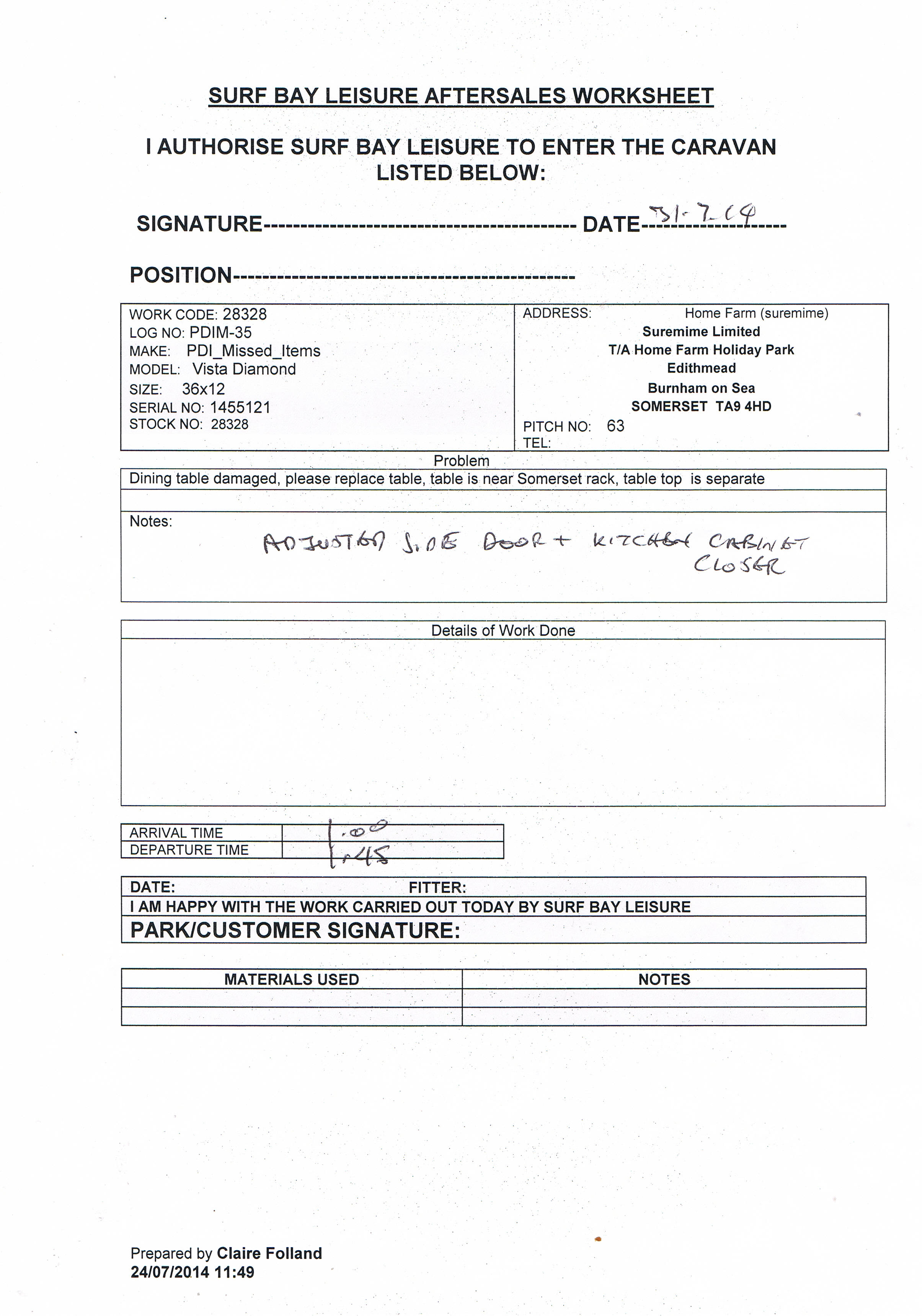 Ellie W (Inactive) added a comment - Engineer adjusted the side door and kitchen cabinet adjuster 31.7.14