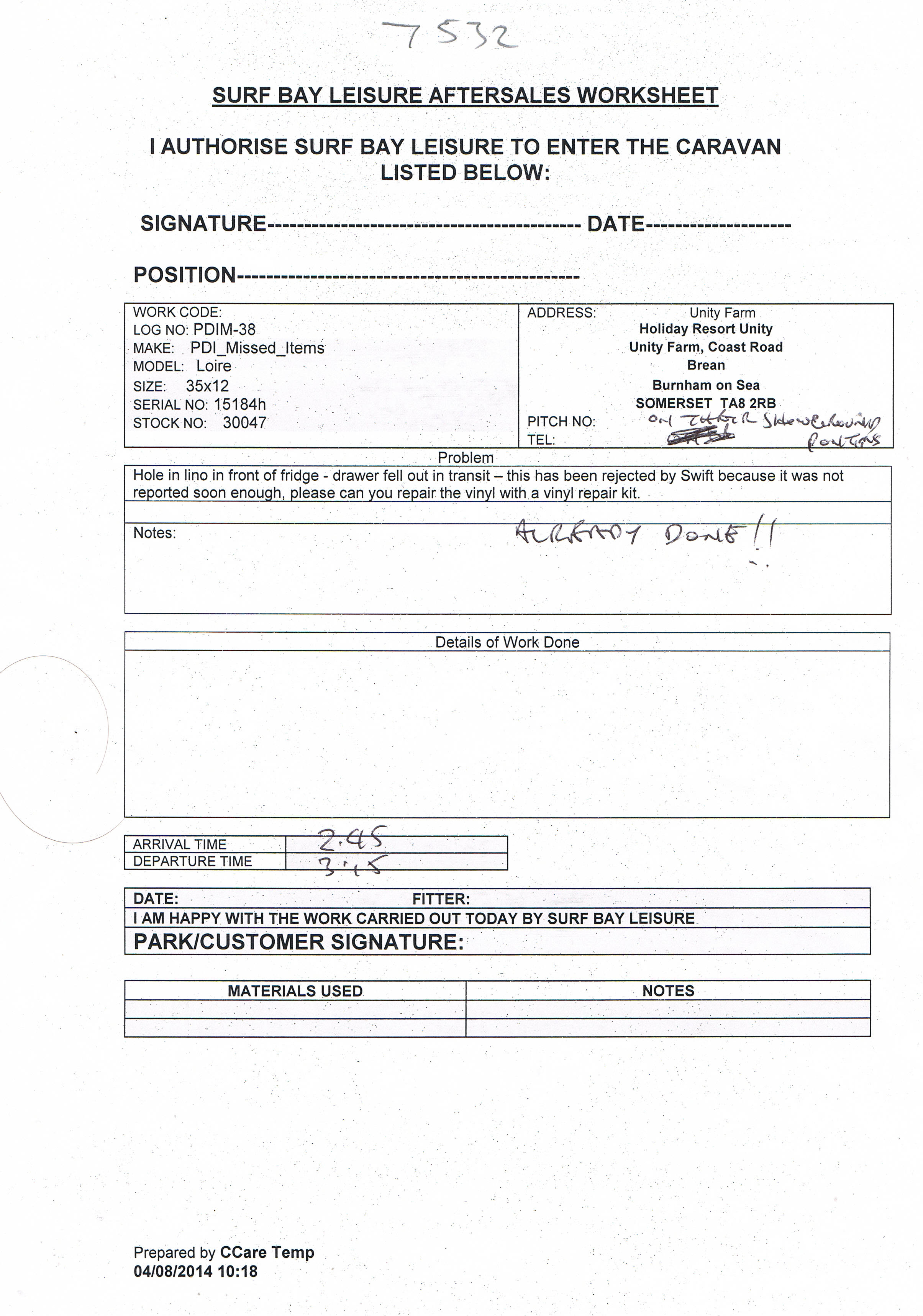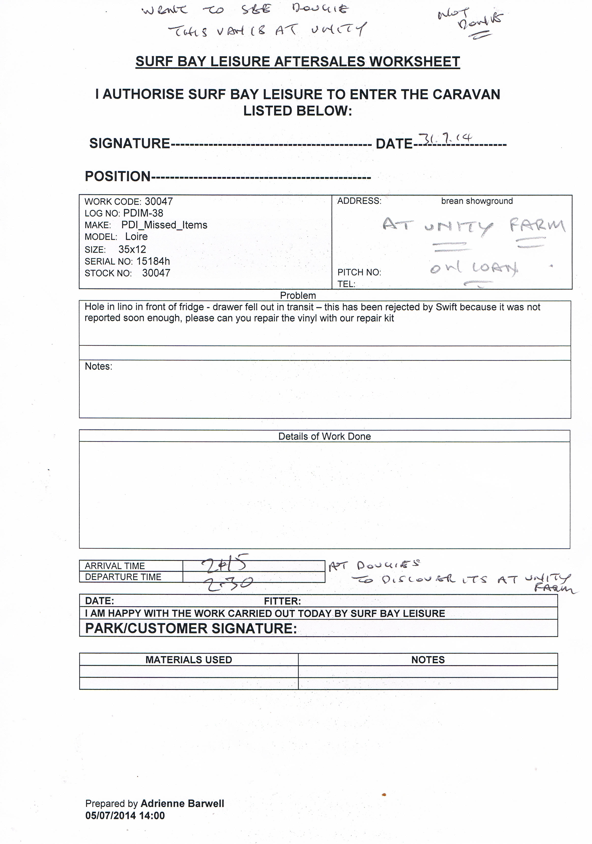 Engineer was sent to Brean Showground however the van is at Unity Farm so I have re-issued a worksheet for this job with the correct address.