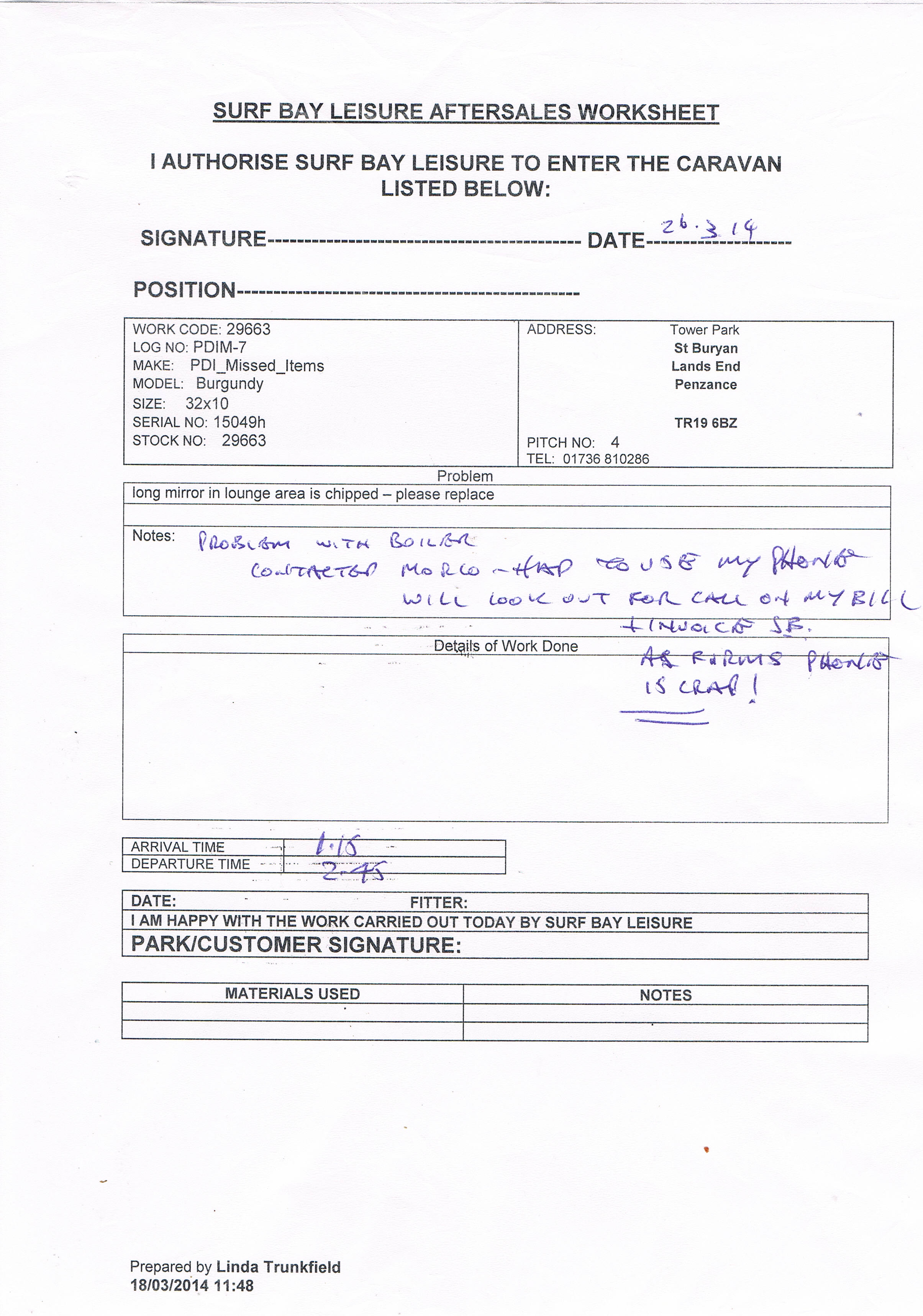 Claire Folland added a comment - Not picked up on pdi, charge to van