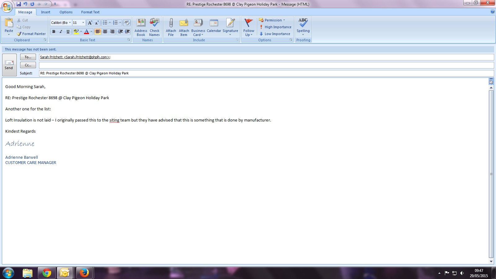 Adrienne Barwell (Inactive) added a comment - E-mail received advising: Hi Adrienne Thank you for the below, we have updated our records and Bill our Production Manager will be over with you on Saturday 20th to attend to this home. Many Thanks Sarah Pritchett Customer Care Account Manager Prestige & Homeseeker Park & Leisure Homes DD: 01933 354017