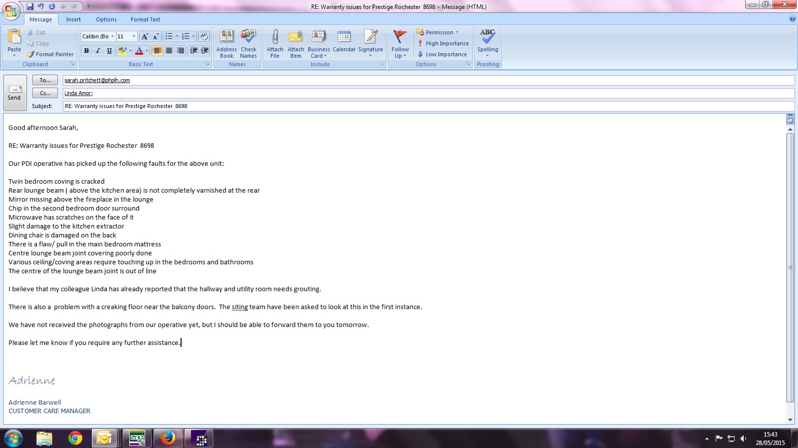 Adrienne Barwell (Inactive) added a comment - E-mail received advising: Hi Adrienne Thank you for the below, we have updated our records and Bill our Production Manager will be over with you on Saturday 20th to attend to this home. Many Thanks Sarah Pritchett Customer Care Account Manager Prestige & Homeseeker Park & Leisure Homes DD: 01933 354017
