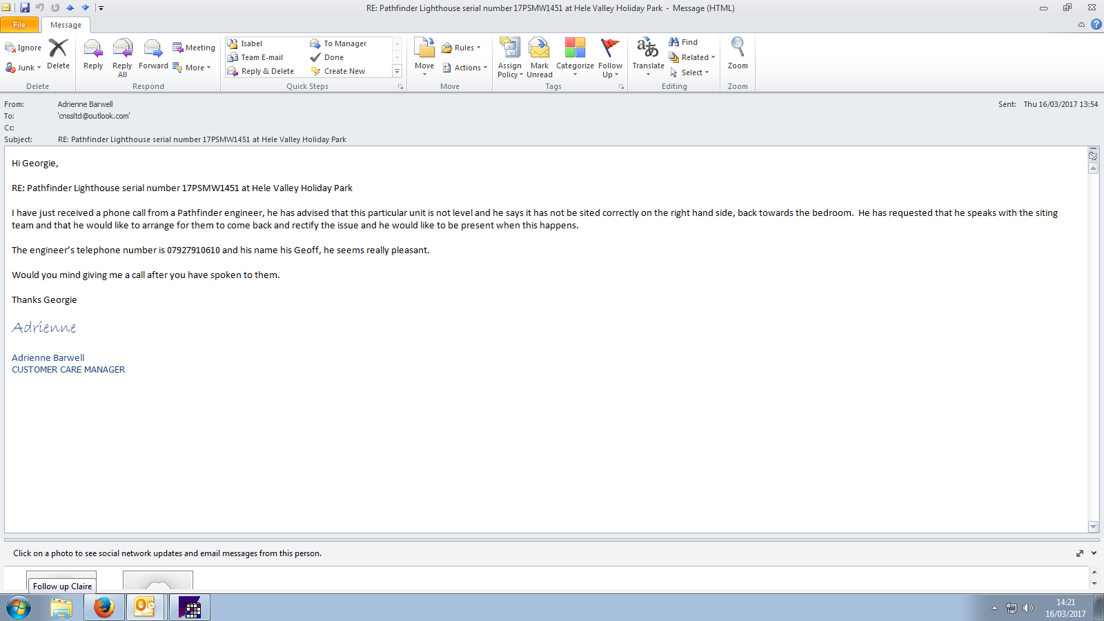 Adrienne Barwell (Inactive) added a comment - Pathfinder engineer Geoff 07927910610