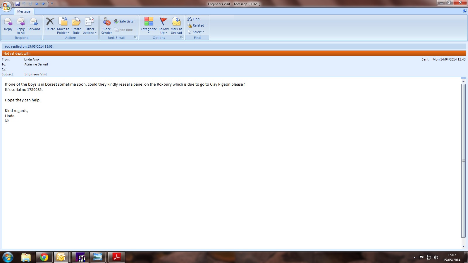 Linda has asked us to re-seal some panels when in the area, however, we have not been up there for a while. I have e-mailed Linda to check if the van is still at Bridport and I will then issue a worksheet