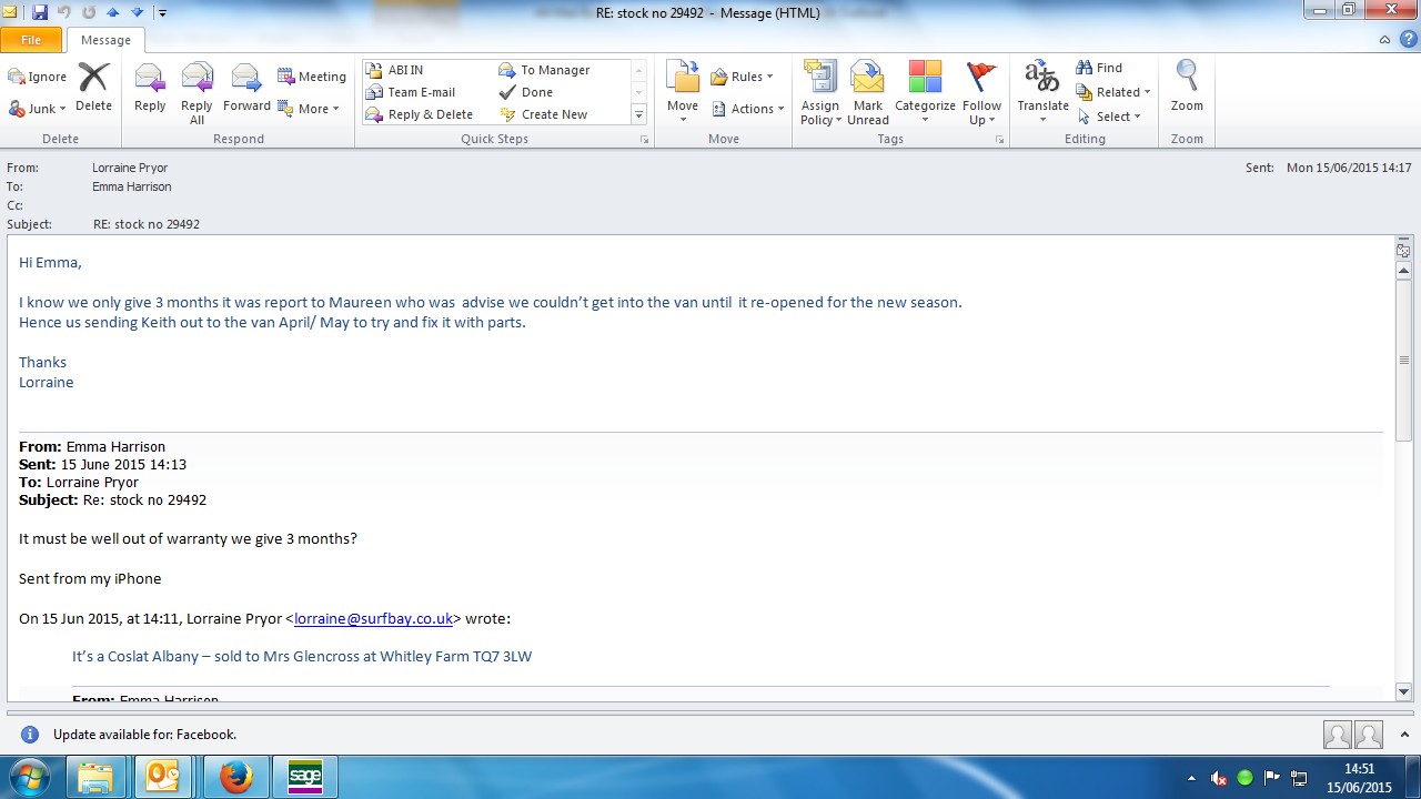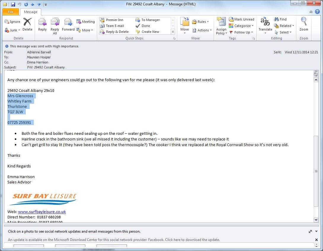 Lorraine Pryor (Inactive) added a comment - Ade has advised me that we would like to send an engineer out this coming Friday 10.07.15. I have called the home no no reply just rings, called the mobile no and left a message asking Mrs Glencross if we could come on Friday and if she can call me back to confirm. Waiting for an reply now.
