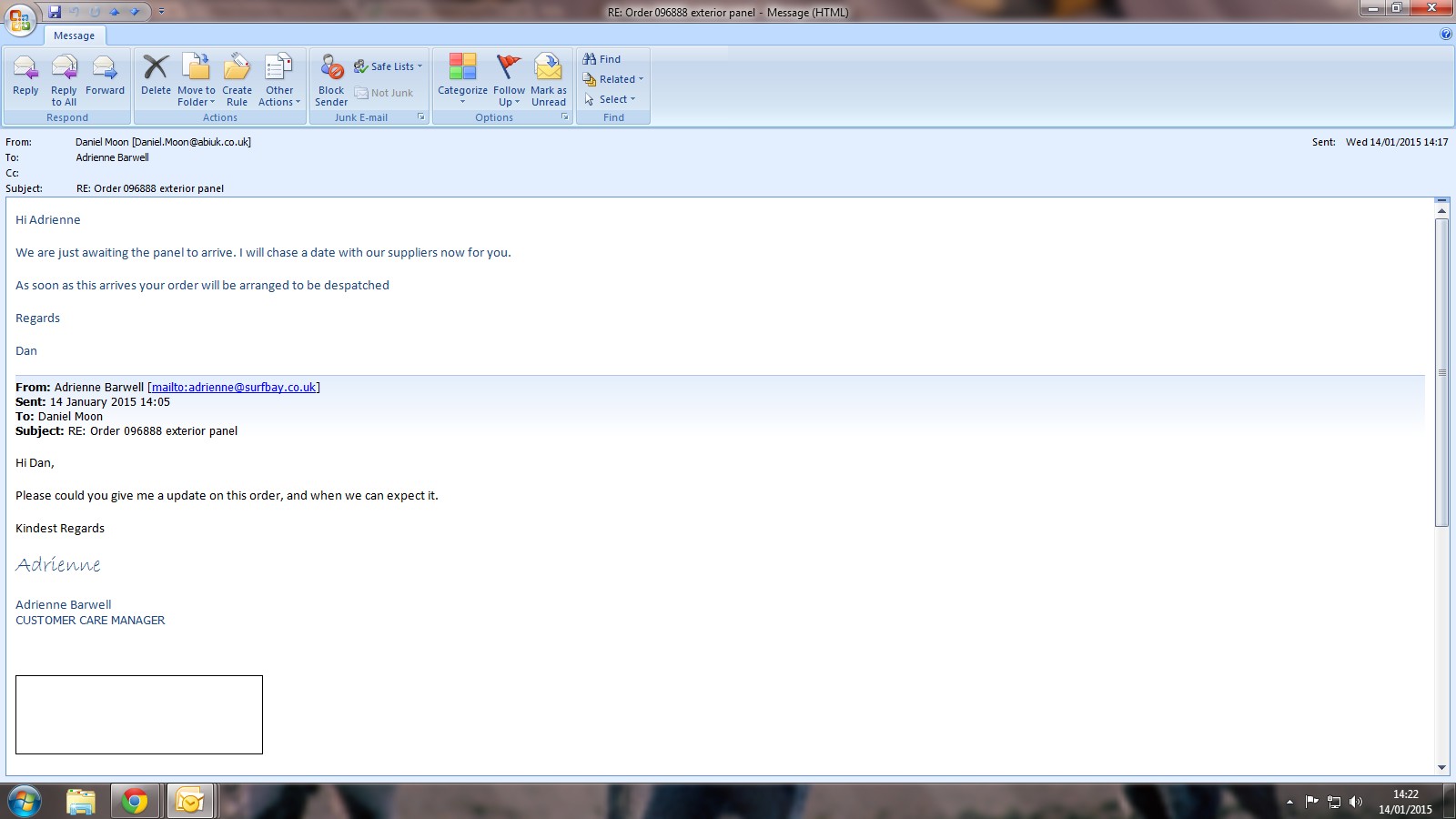 Gavin is in a hurry for this panel, as he has sold the unit to Unity Farm. I have asked if he would just like the panel and corner ordered or whether he would like us to wait for a quote. Gavin is happy for us to proceed without a quotation.