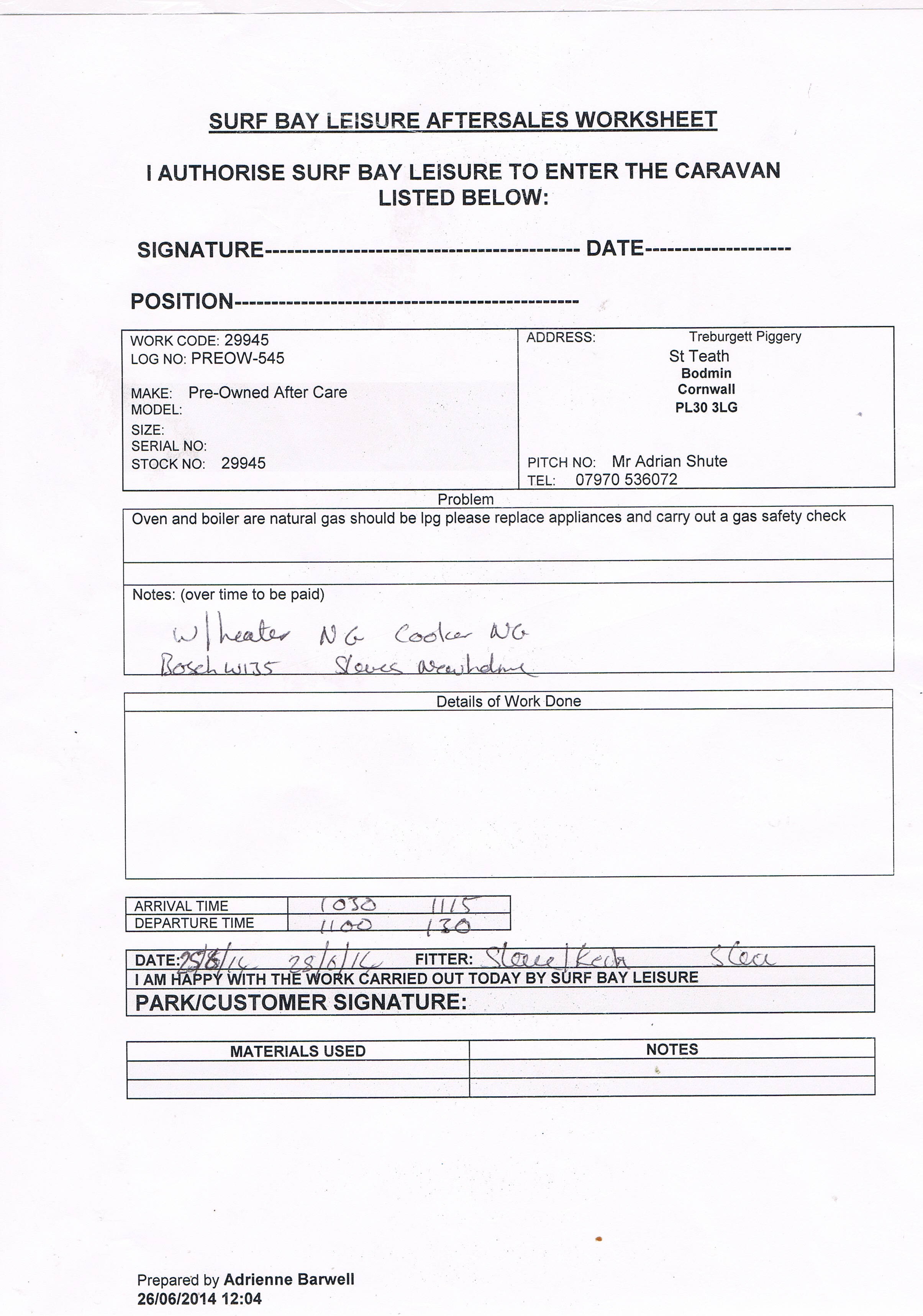 Adrienne Barwell (Inactive) added a comment - Emma has contacted the customer who has agreed that Sunday is fine, she has also asked that Steve carries out a gas safety check whilst at the van