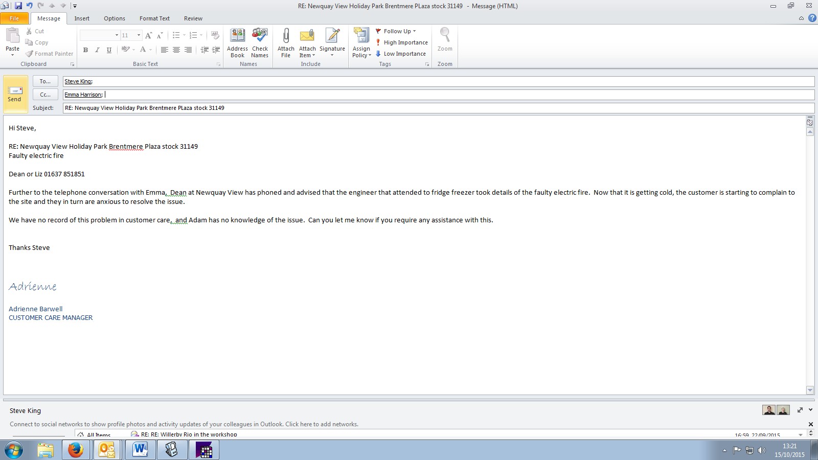 Dean has advised that the customer is getting a bit fed up because she has no heating in the lounge