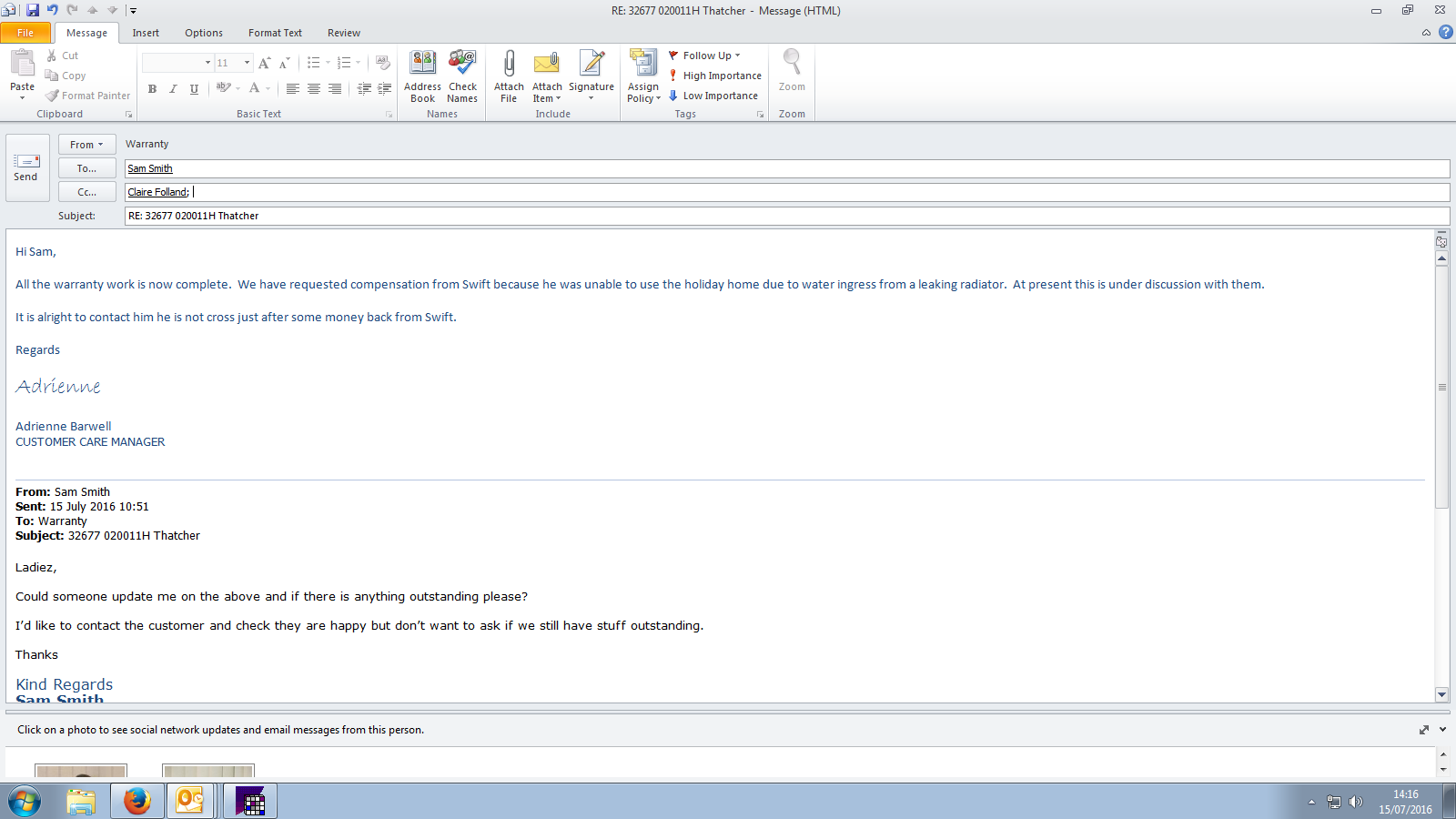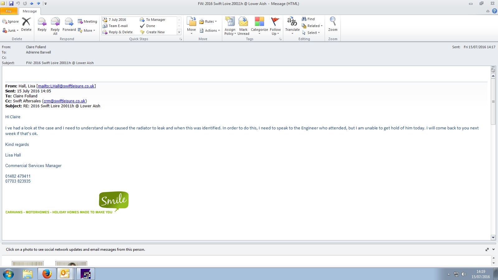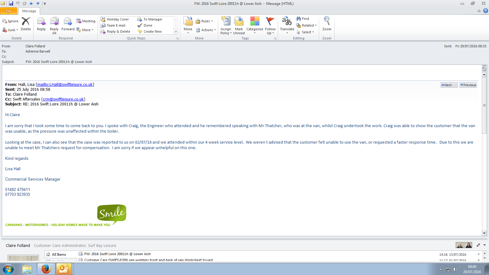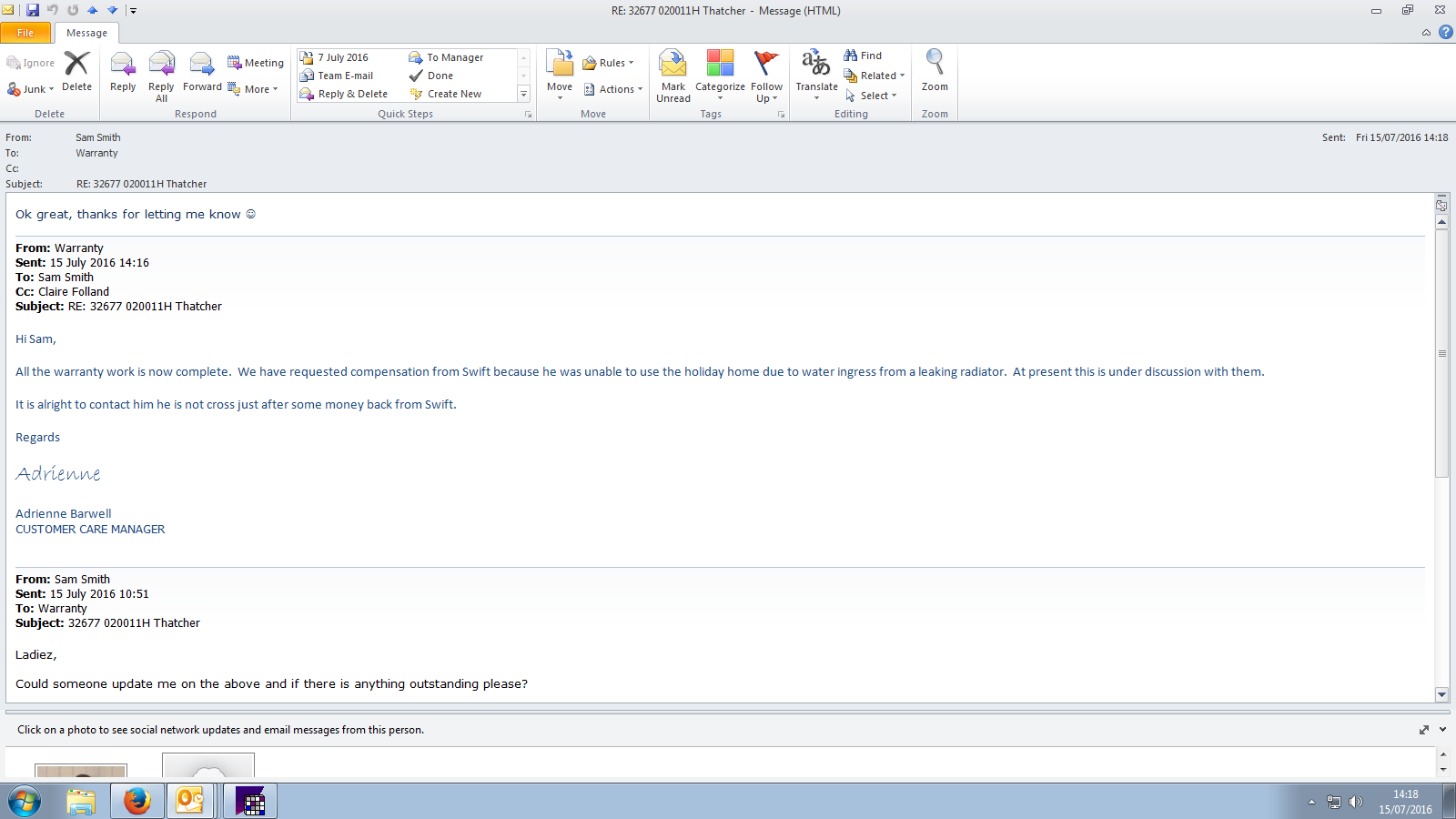 Mr Thatcher would also like his warranty to start from now because he has not had any use out of holiday home. Again we will ask this question of Lisa at Swift.