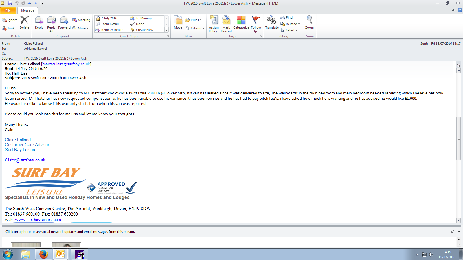 Mr Thatcher would also like his warranty to start from now because he has not had any use out of holiday home. Again we will ask this question of Lisa at Swift.