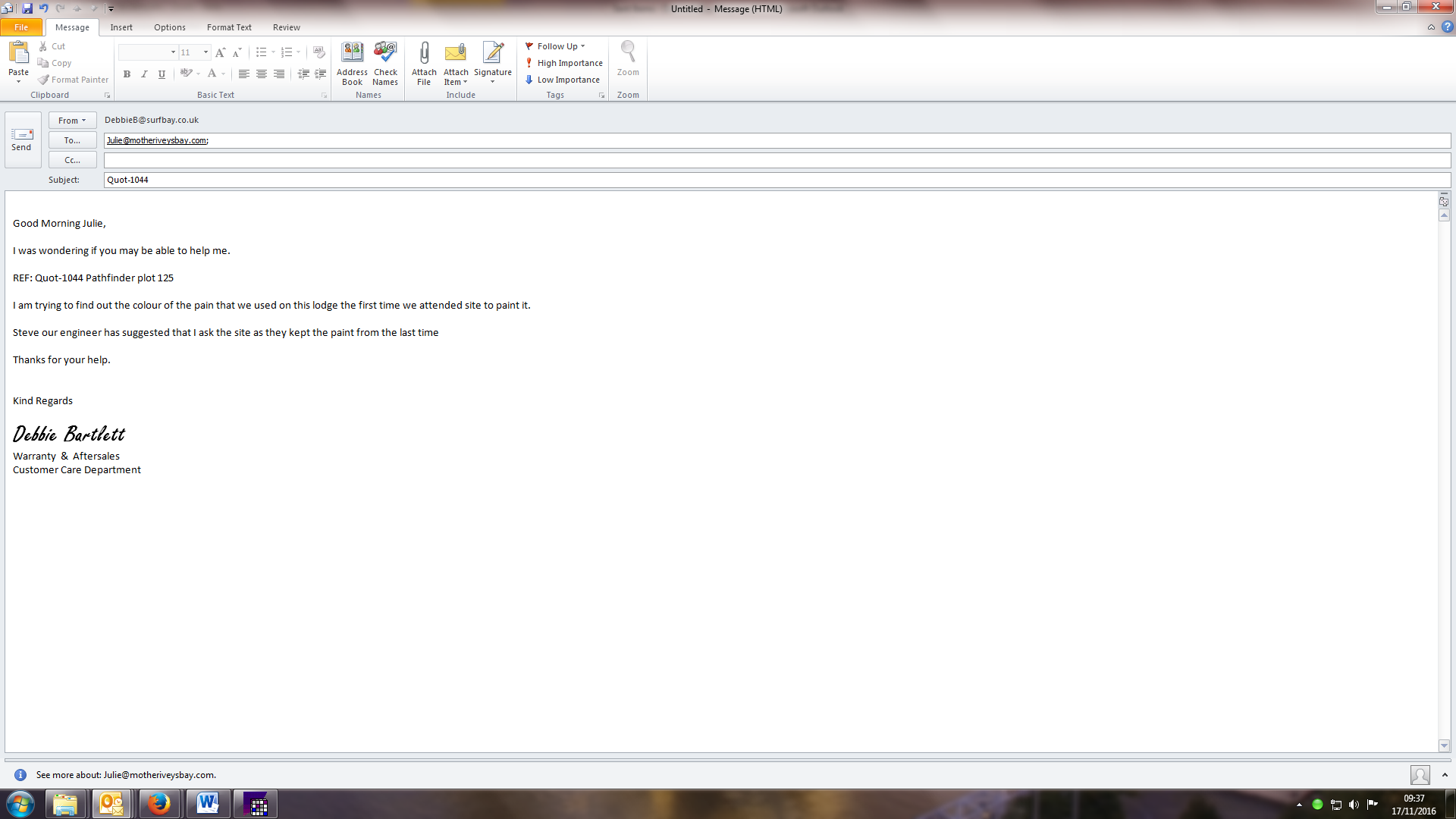 Debbie Bartlett (Inactive) added a comment - Steve has advised that a contact site ref the paint colour as we are struggling to find any recorded of it. Email attached.