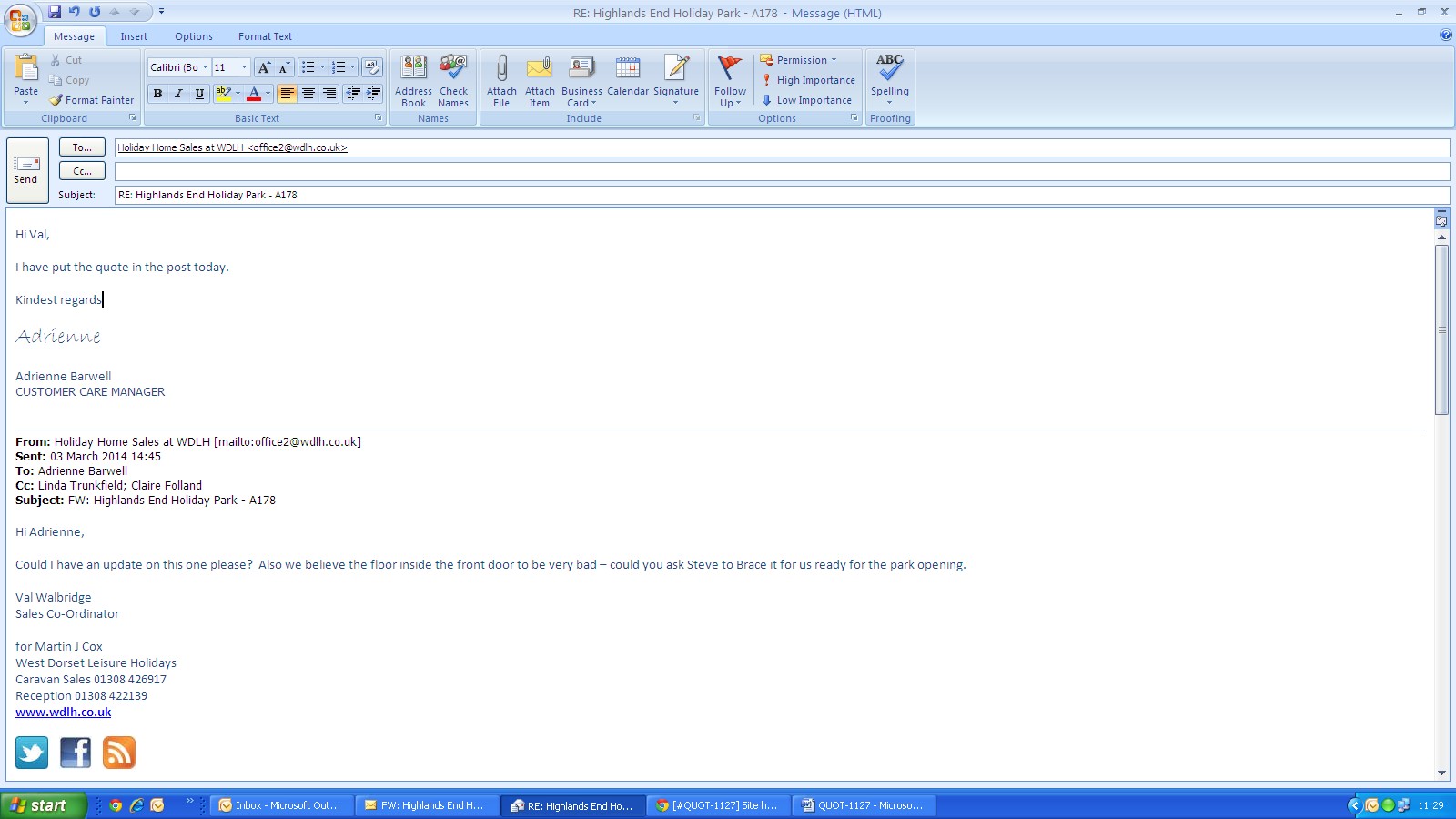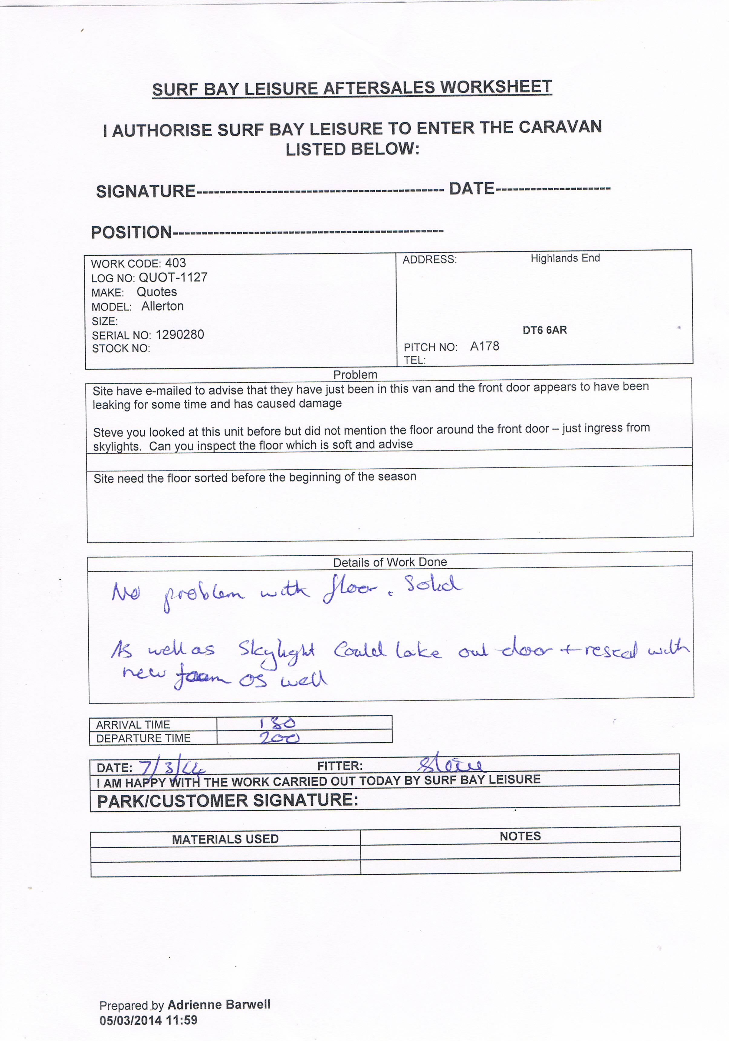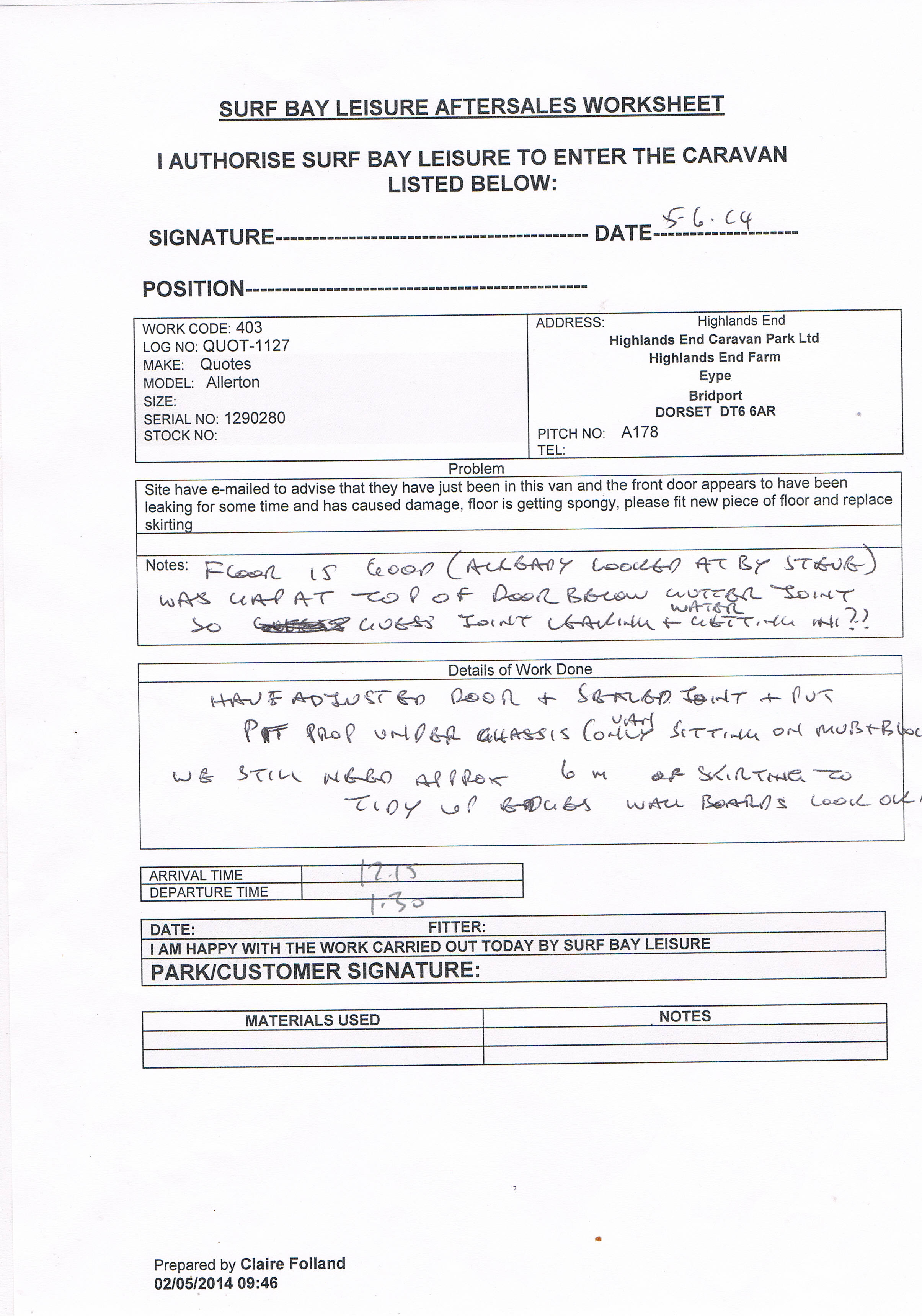 Claire Folland added a comment - Mrs Colley has called to ask when the rest of the work will be carried out, looks like most of the work has been carried out, we only have skirting left to fit, Ade is hoping to schedule this in for next week, she does not want us to attend wc 27th July as she is taking her elderly parents to the van, have looked in file but can not find worksheet, have issued another one