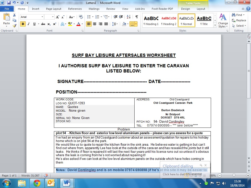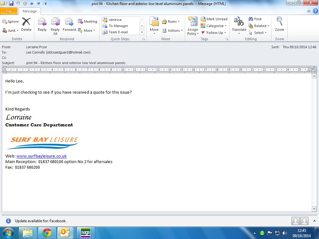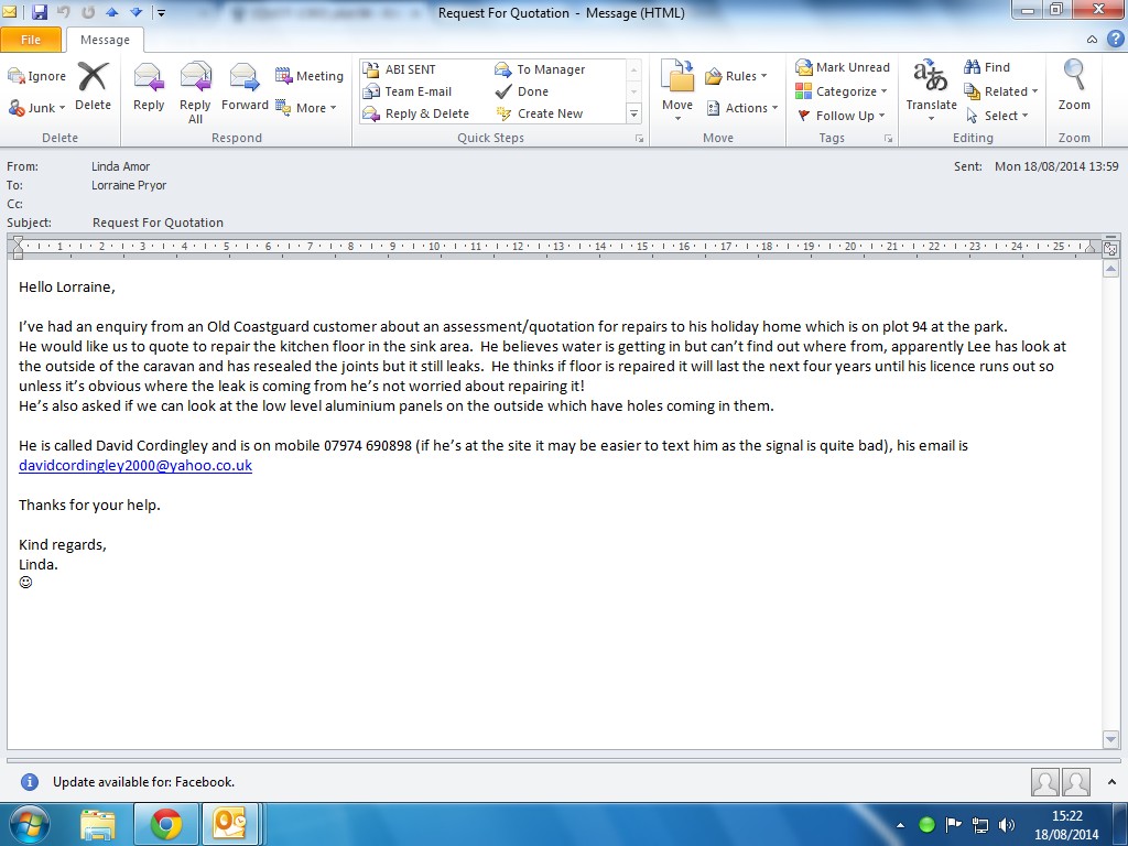 I’ve had an enquiry from an Old Coastguard customer about an assessment/quotation for repairs to his holiday home which is on plot 94 at the park.