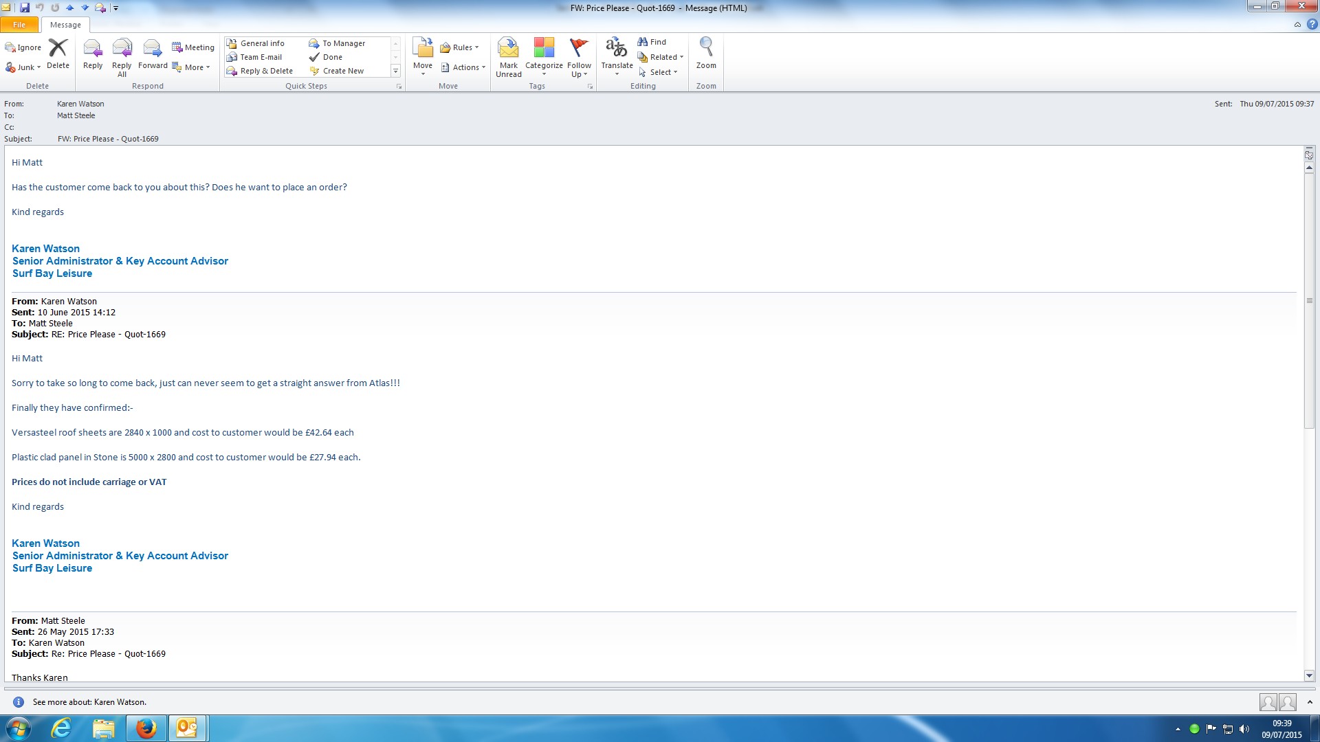 Karen Watson (Inactive) added a comment - - edited Advised Adrienne I gave Matt prices supplied by Atlas on 10.06.15, but overlooked updating Jira to that affect - done now. As Matt has not come back to me, sent him an email asking if the customer had come back to him and does he want to order?