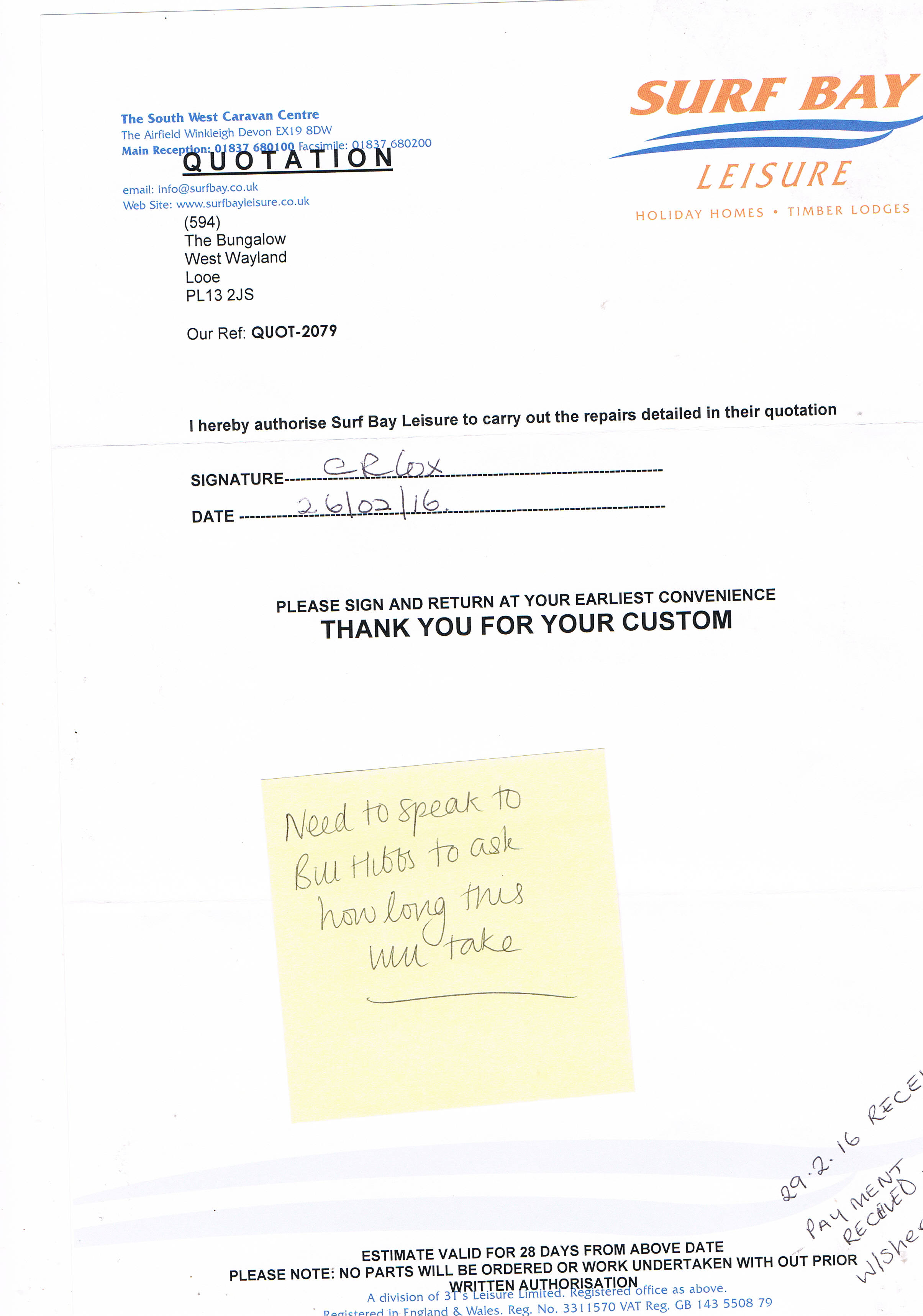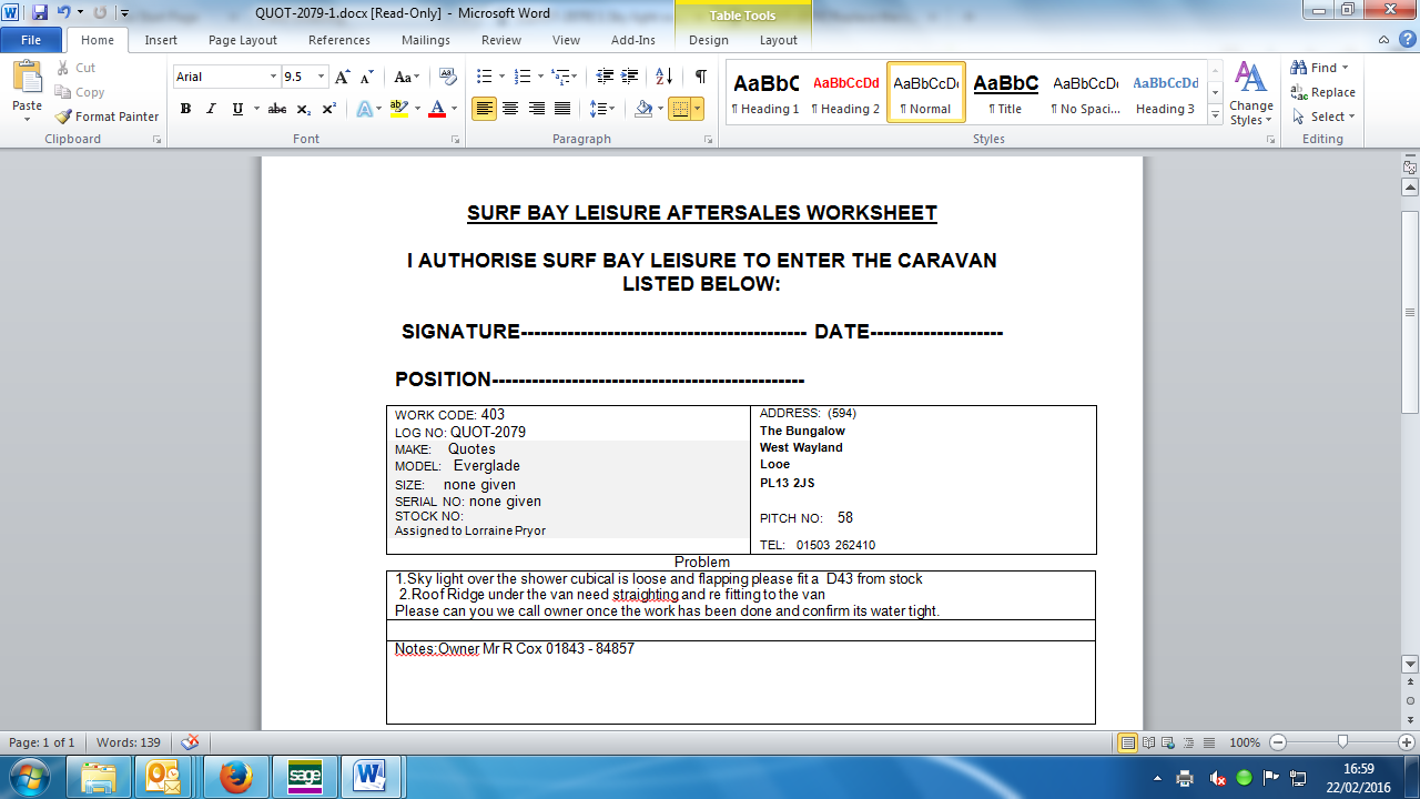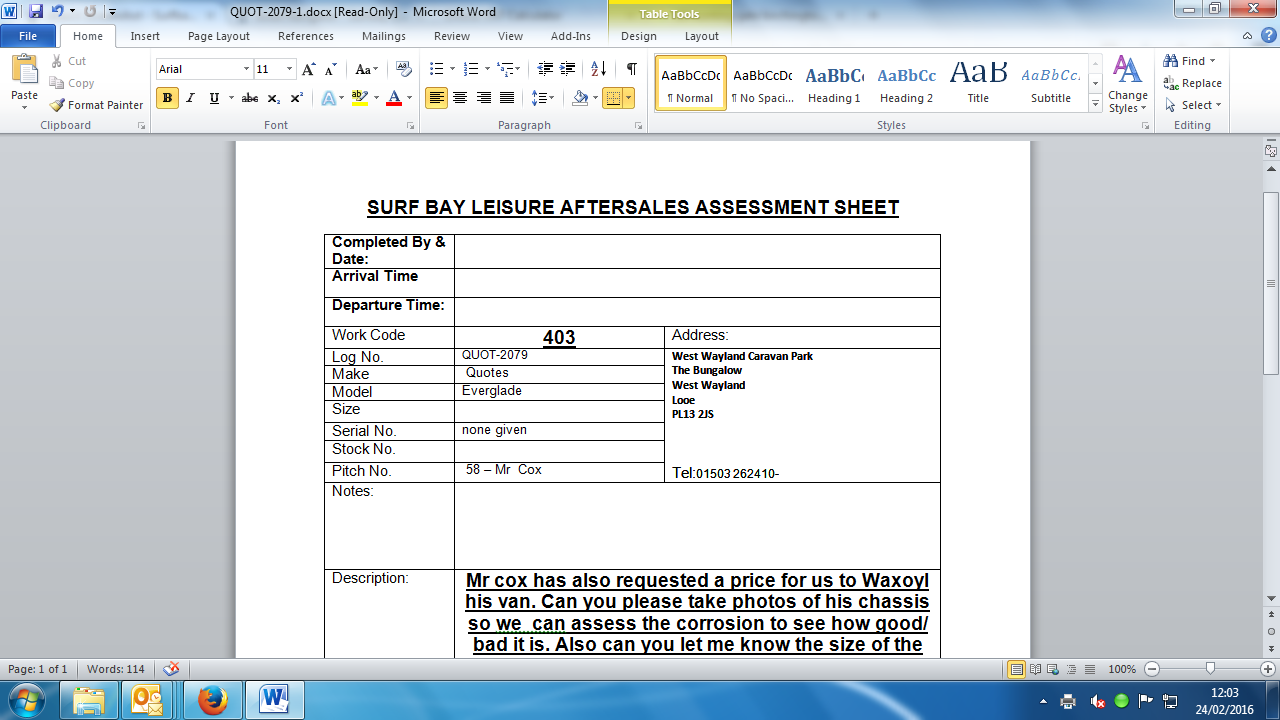 Printed work sheet for the engineers to attend and asses this, the lady was very vague on the phone as she was contacted by the park owners this morning.Work sheet filed