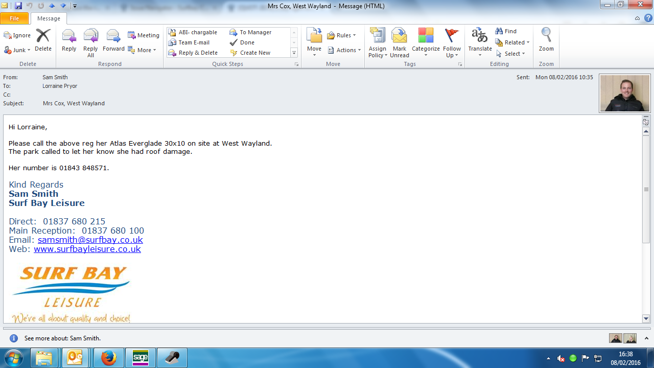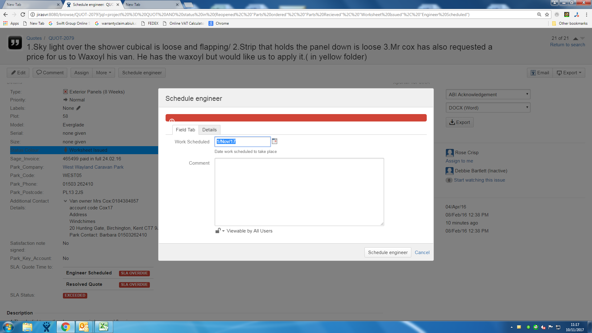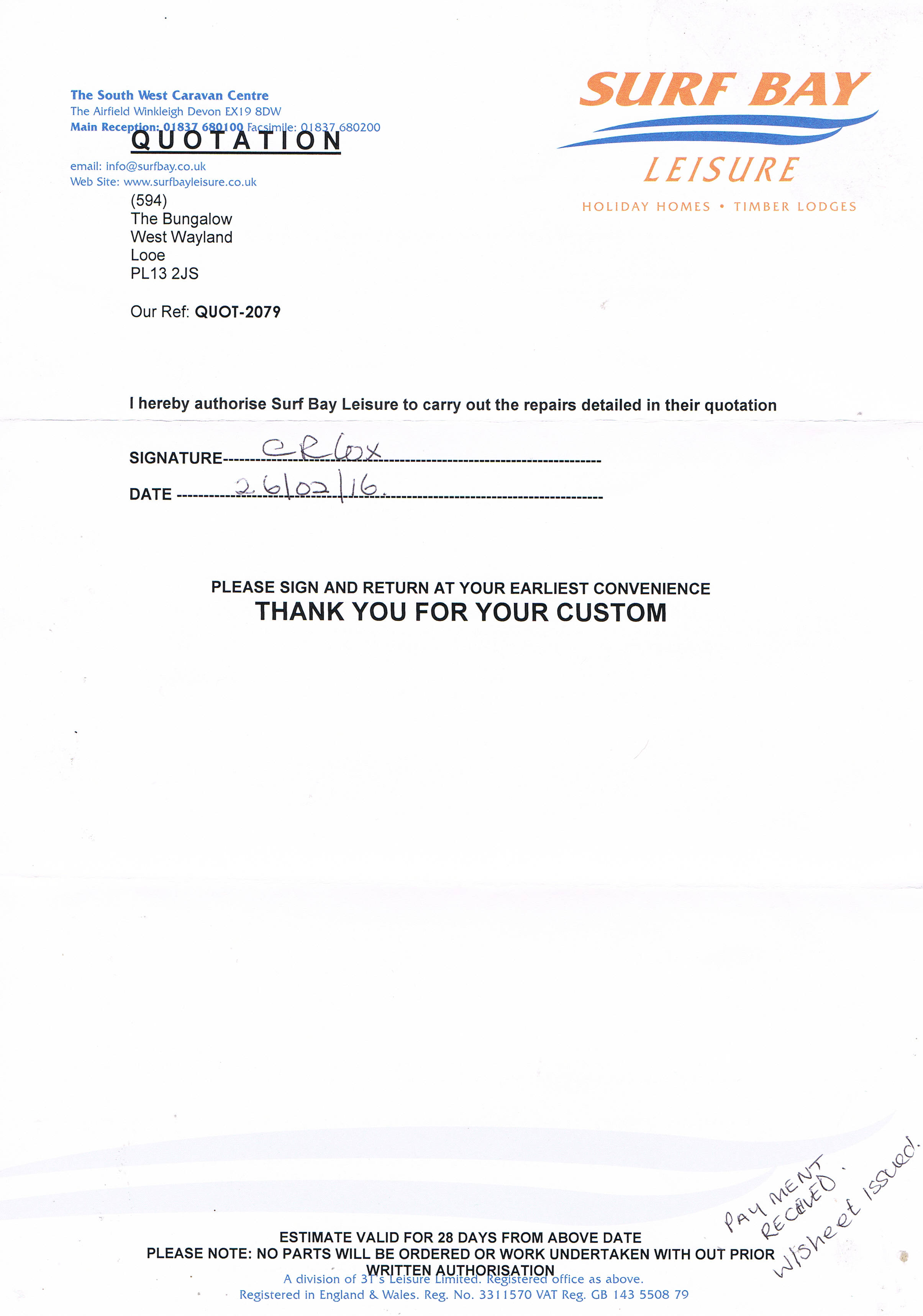 Printed work sheet for the engineers to attend and asses this, the lady was very vague on the phone as she was contacted by the park owners this morning.Work sheet filed