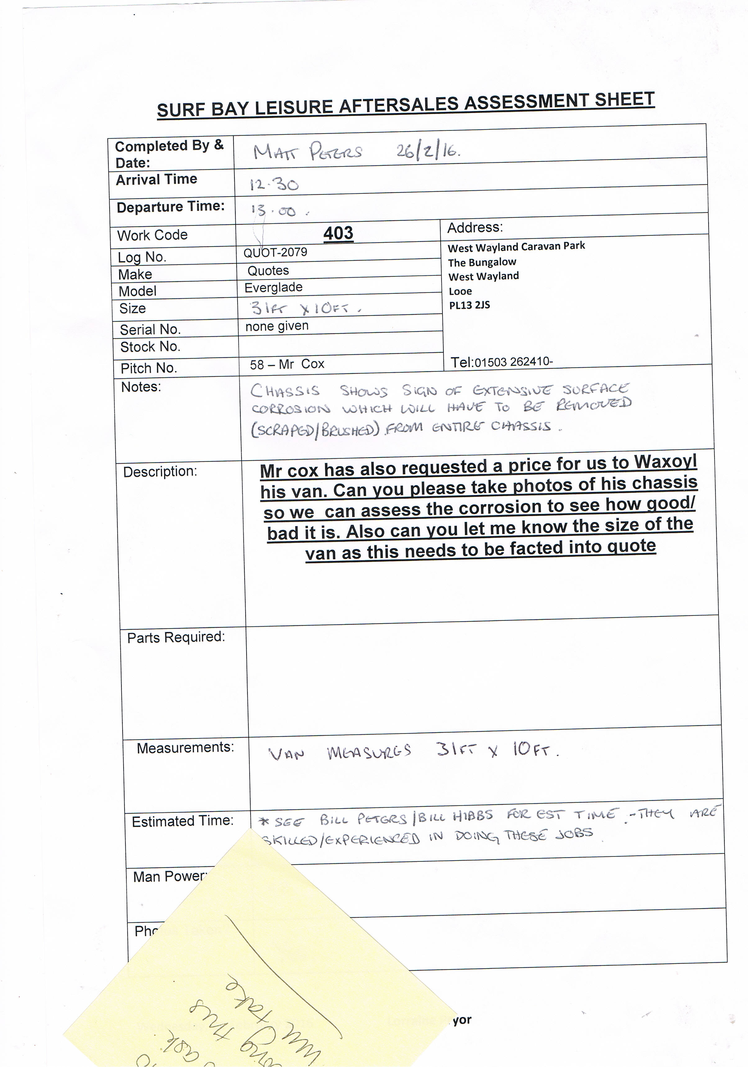 added a comment - - edited Printed work sheet for the engineers to attend and asses this, the lady was very vague on the phone as she was contacted by the park owners this morning.Work sheet filed