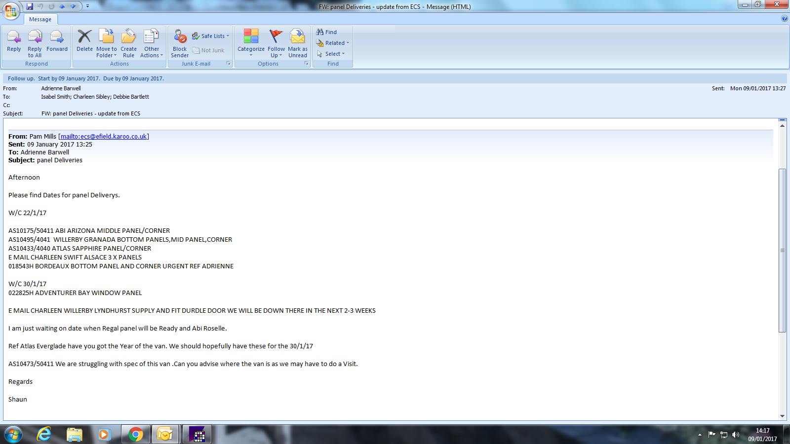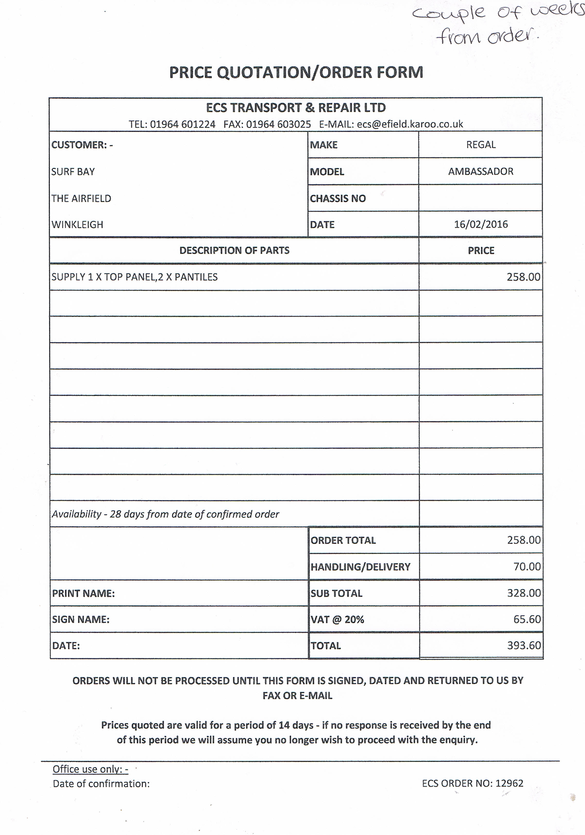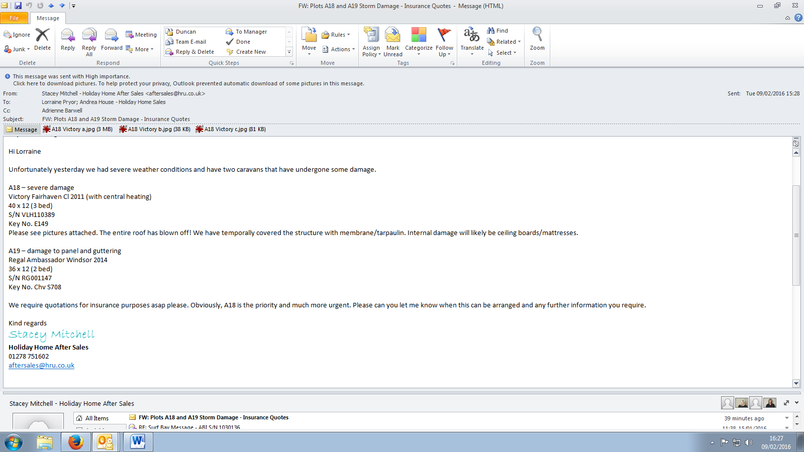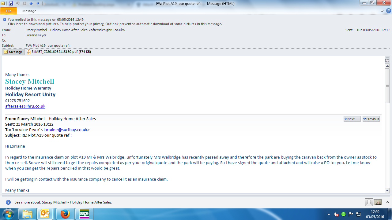 Damage to panel and guttering- Stacey at park has request the work is carried out for the new owners Mr & Mrs miles park are paying for repairs -2 man job - 1 day