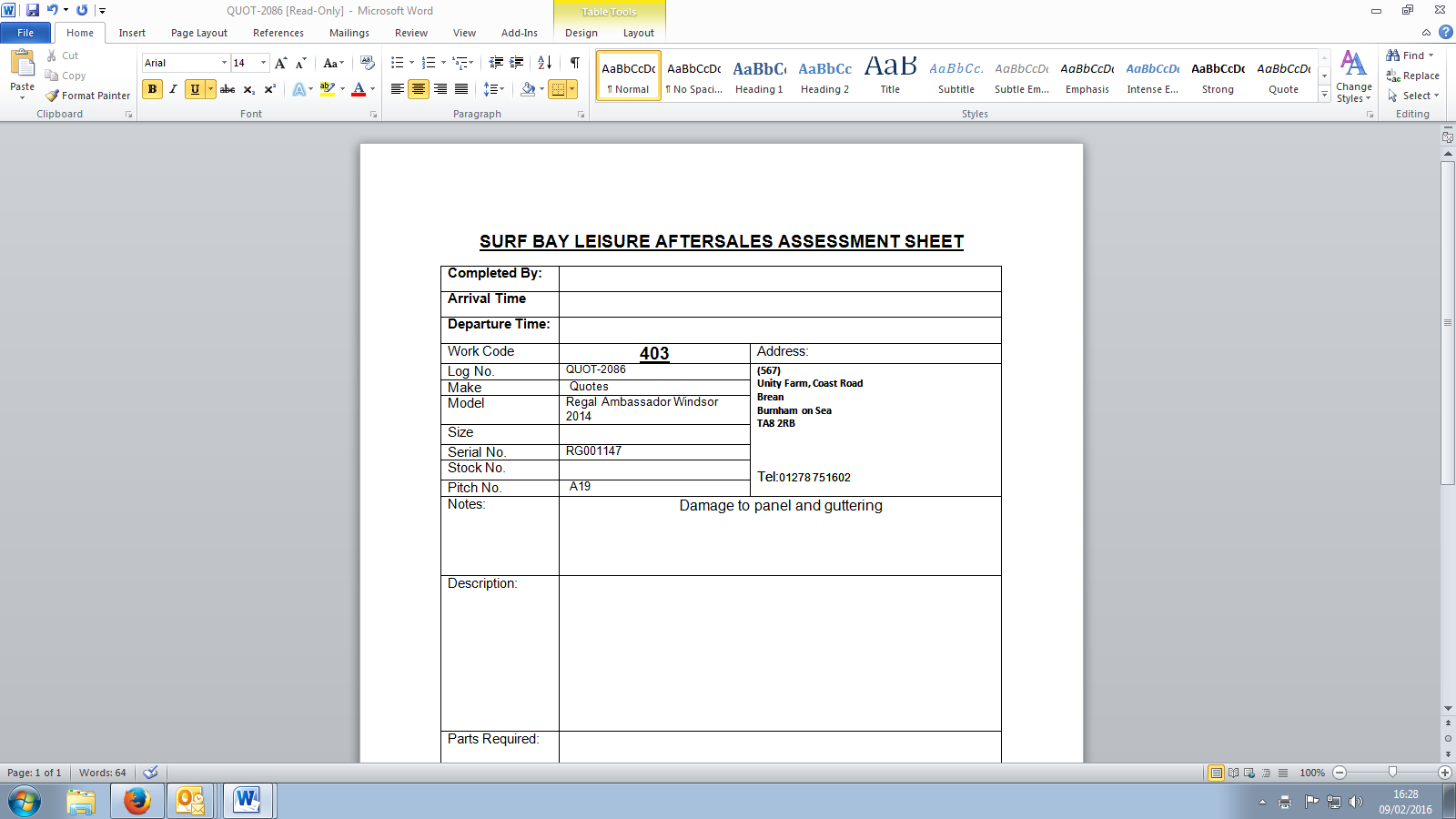 | Attachment | 15.02.16 engineer assessmnet sheet for - QUOT-2086.pdf [ 111322 ] |