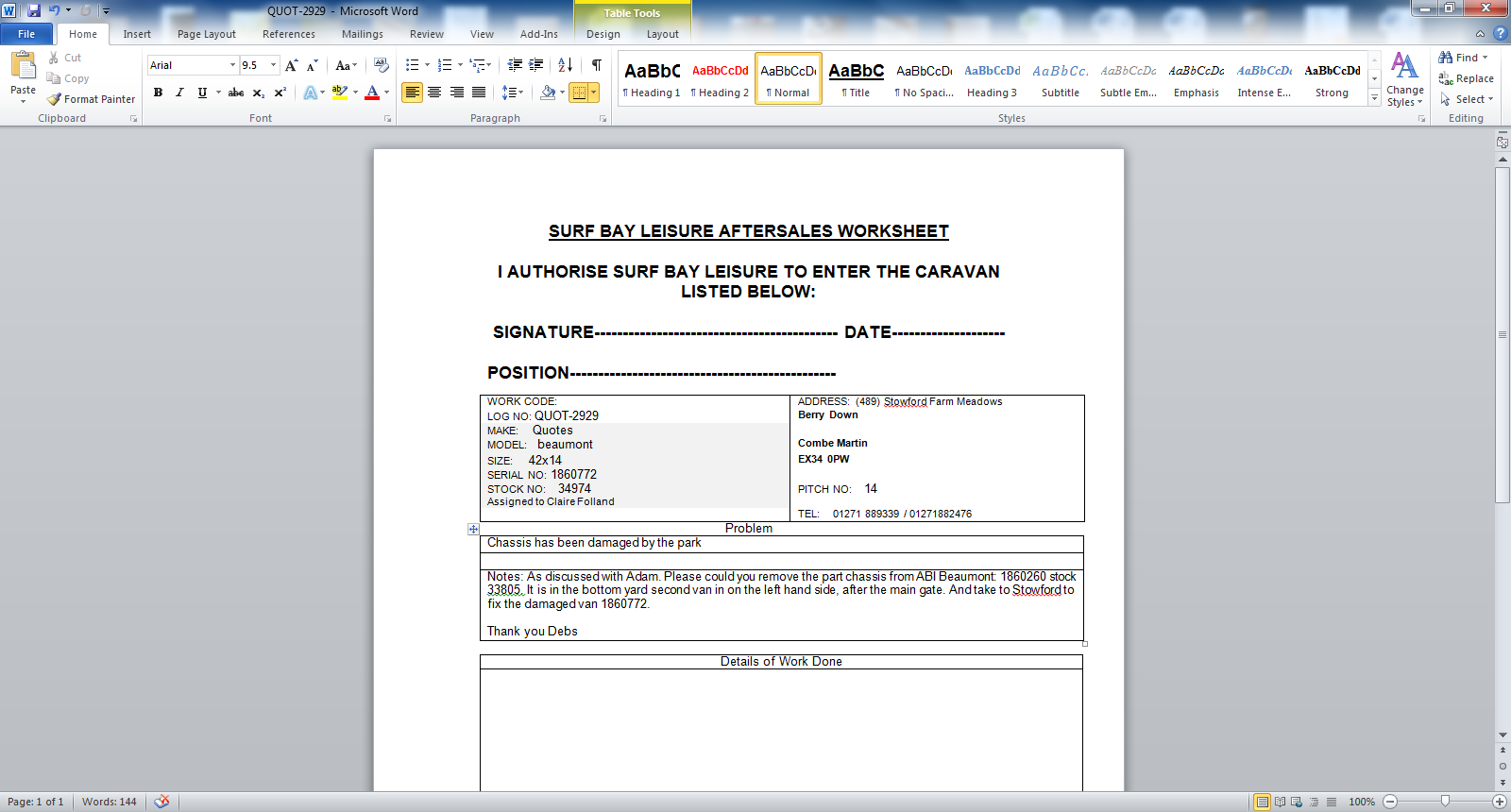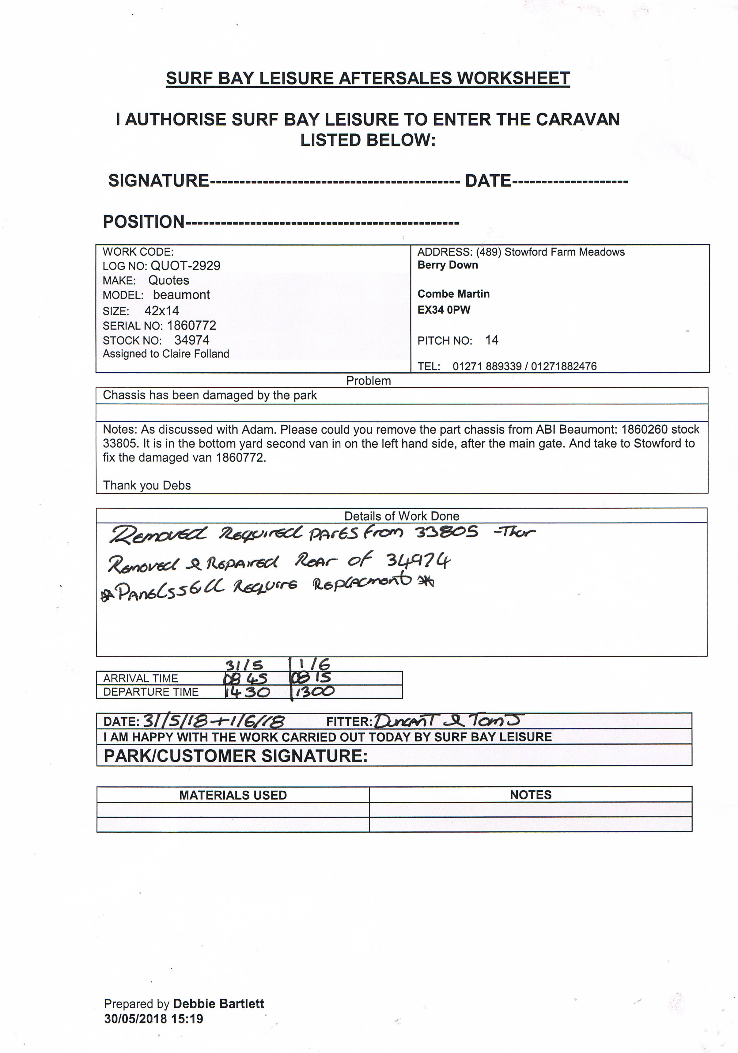 chassis has been damaged by the park ** Completed at Stowford ** STILL TO replaced on yard van