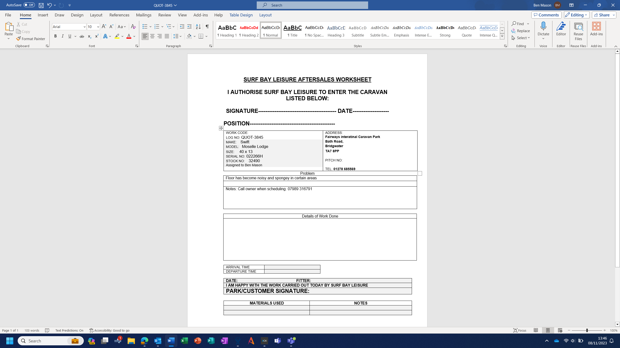 Ben Mason (Inactive) added a comment - Customer called and reported an issue with the floor. Said when we are next in the area we will give her a call to carry out an assessment to diagnose the issue and go from there. Mrs D Puddy 07989 316791