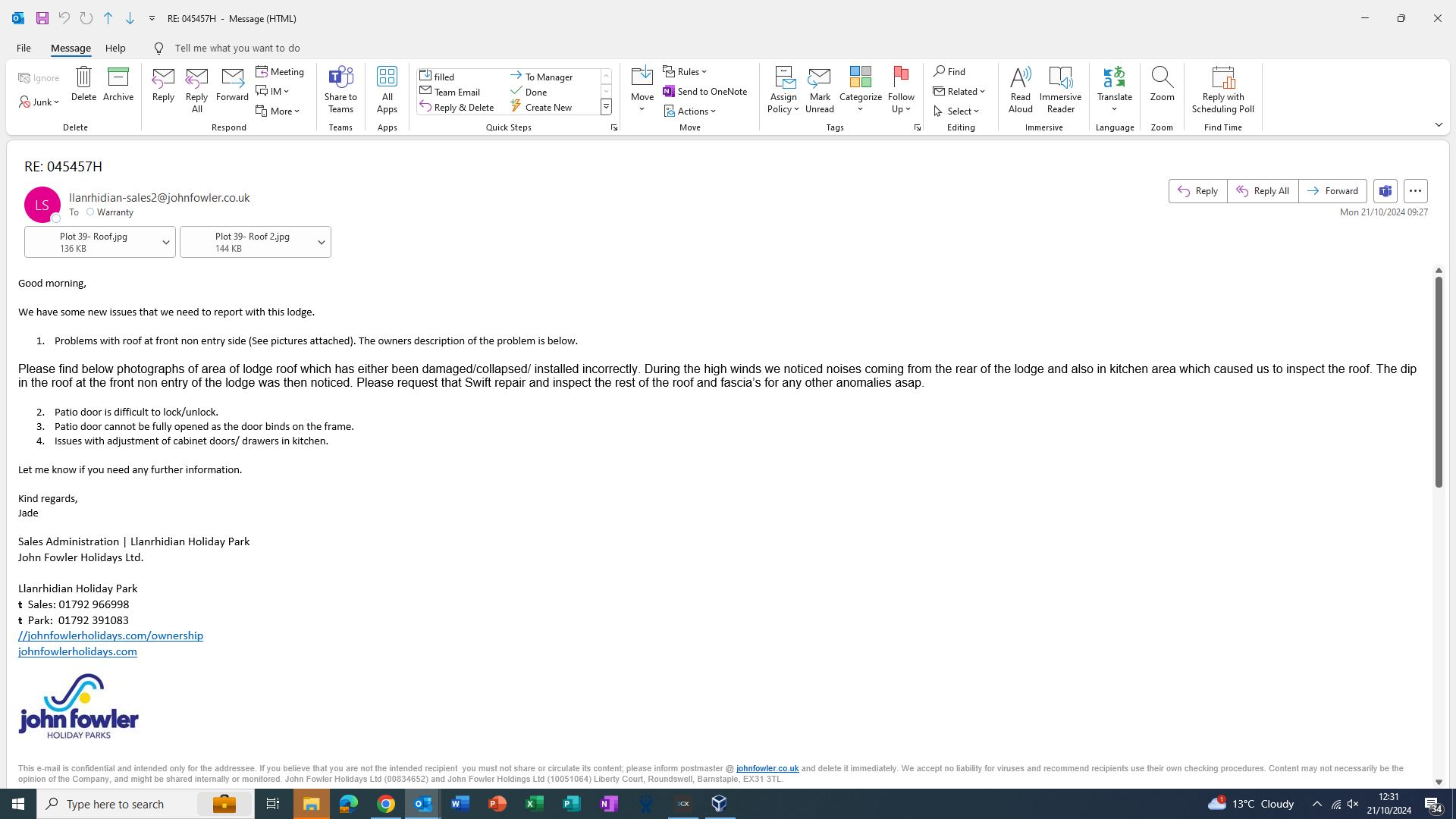 Duncan Thomson added a comment - Have ordered new locks and keys as requested by matt Steele for park to fit, unrelated to this claim but have made a not on this quote for reference as we might need to fit when on park fixing the roof.