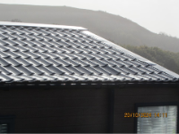 of area of lodge roof which has either been damaged/collapsed/ installed incorrectly. During the high winds we noticed noises coming from the rear of the lodge and also in kitchen area which caused us to inspect the roof. The dip in the roof at the front non entry of the lodge was then noticed.