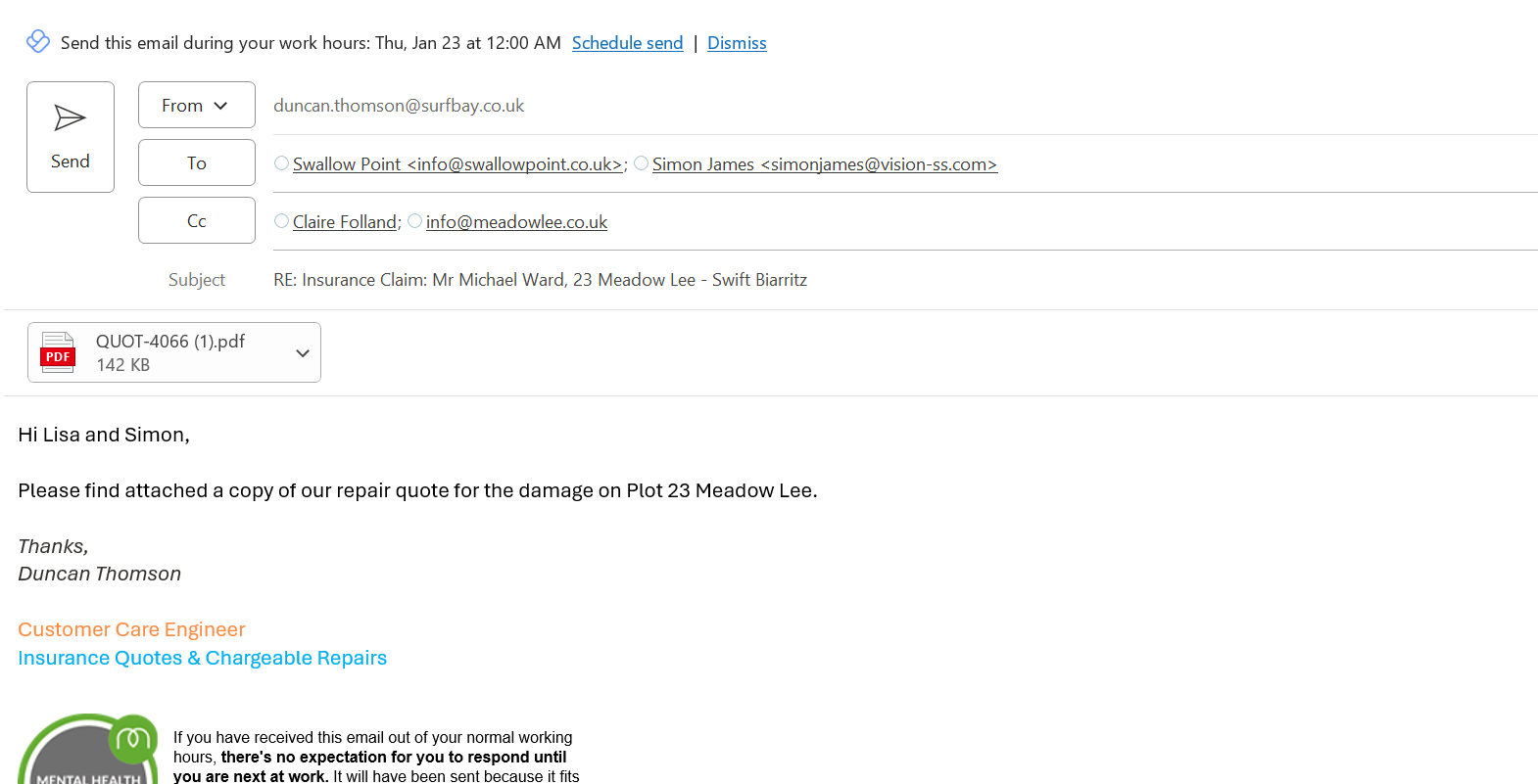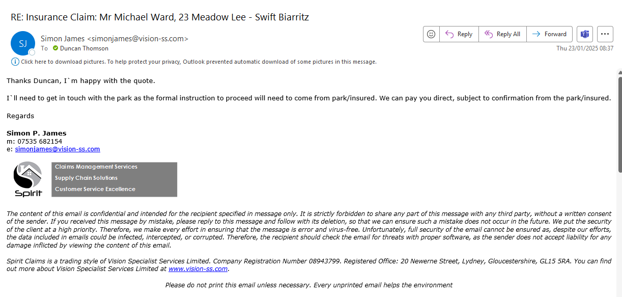 Claire Folland added a comment - Good Afternoon Clive & Lisa I am pleased to confirm that we are happy with the repair quote provided by Surf Bay (attached). Payment totalling £253.60, net of £50 will be made to Surf Bay subject to receipt of the final invoice and confirmation that the works have been completed to the insureds satisfaction. Should you have any queries regarding the above, please get in touch using the details below. Regards Simon P. James m: 07535 682154 e: simonjames@vision-ss.com