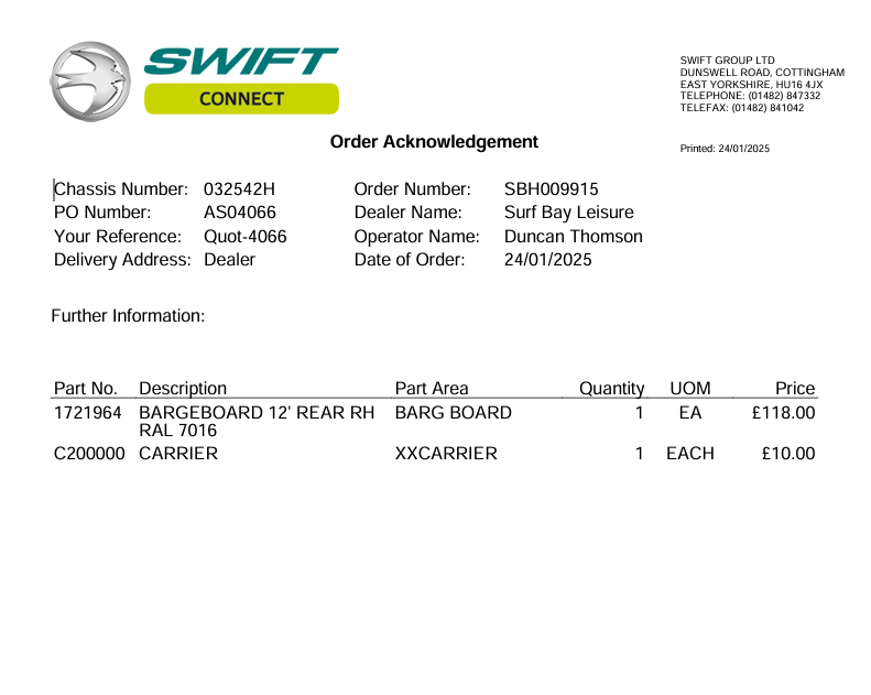 Claire Folland added a comment - received replacement bargeboard from swift, labelled and placed on rack, issued worksheet