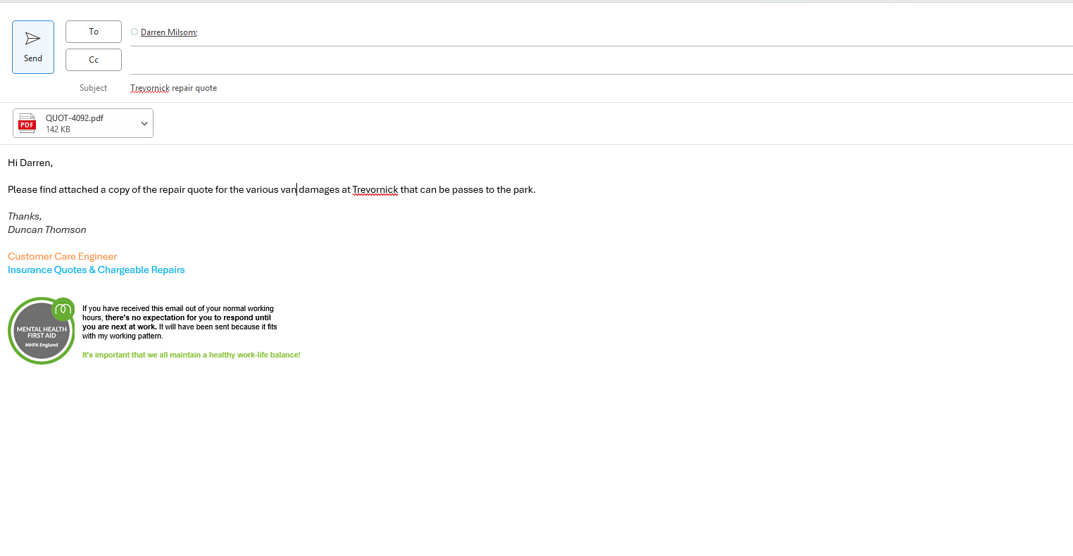 | Summary | Quote for Duncan at Trevornick. Needs a quote number to place an order | Quote for Tornado damage - various vans |