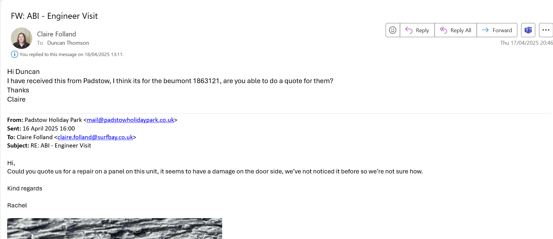 Duncan Thomson added a comment - asked park for more photos from distance to see which section of cladding is damaged to get a quote from ABI