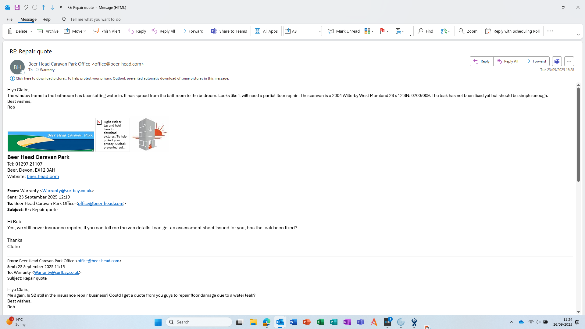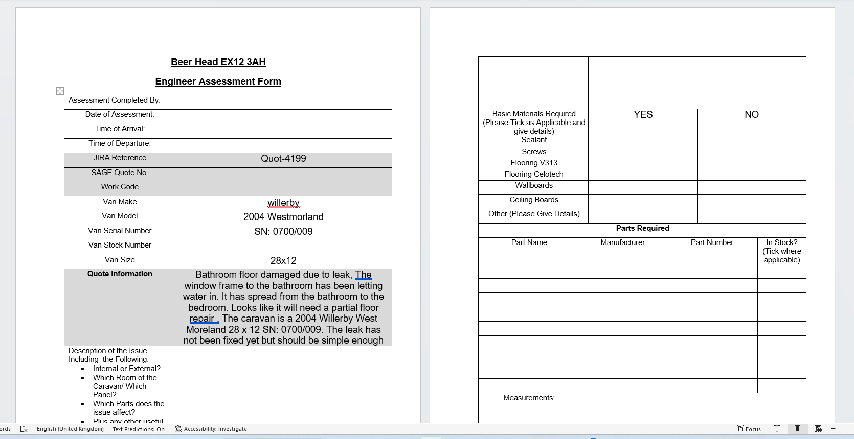 The window frame to the bathroom has been letting water in. It has spread from the bathroom to the bedroom. Looks like it will need a partial floor repair . The caravan is a 2004 Willerby West Moreland 28 x 12 SN: 0700/009. The leak has not been fixed yet but should be simple enough.