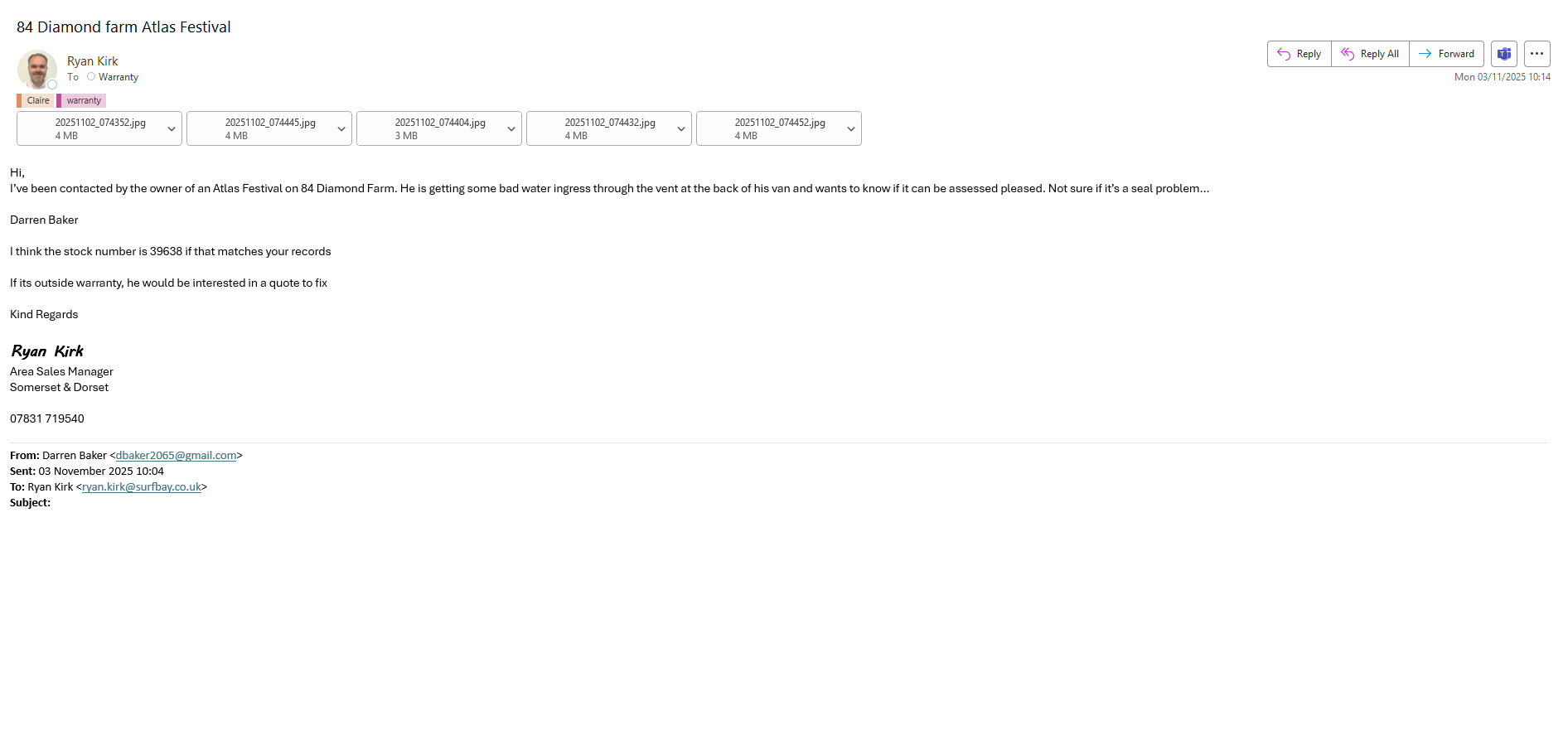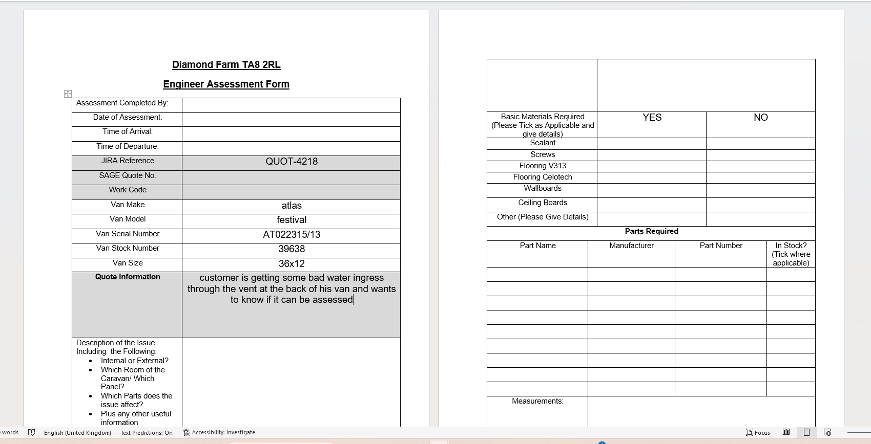 | Summary | customer is getting some bad water ingress through the vent at the back of his van and wants to know if it can be assessed pleased | customer is getting some bad water ingress through the vent at the back of his van and wants to know if it can be assessed |
