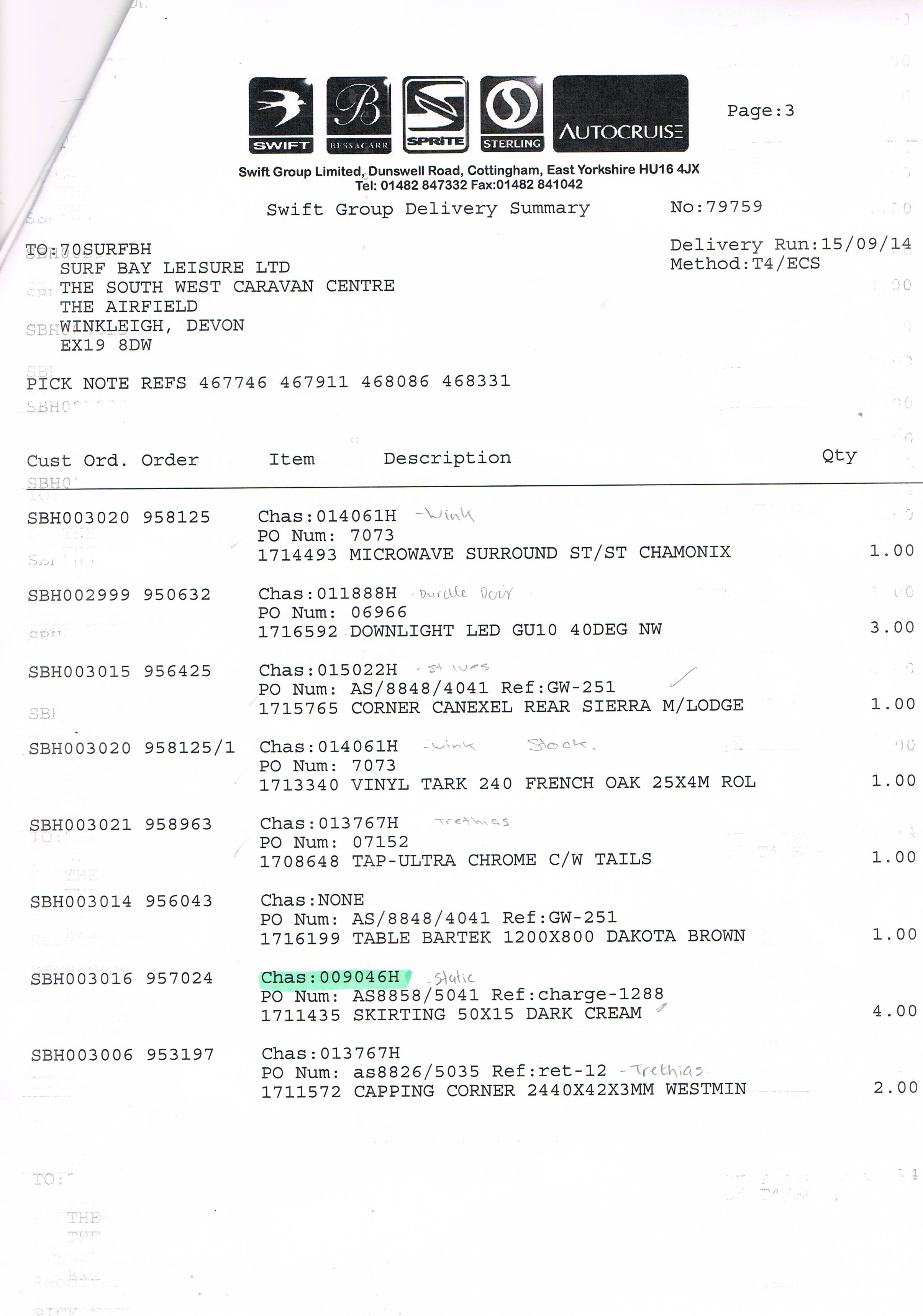 recieved replacement bi-fold strip part number 1711572 delivery note 79759, issued worksheet
