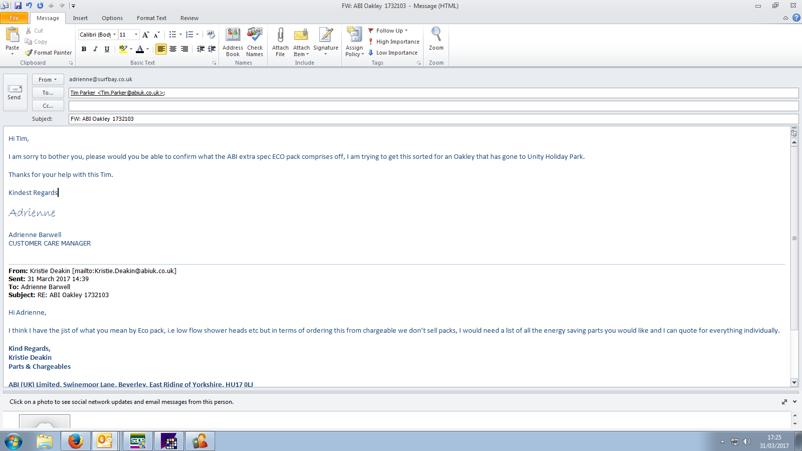 I have e-mailed ABI asking for the parts to be delivered direct to site