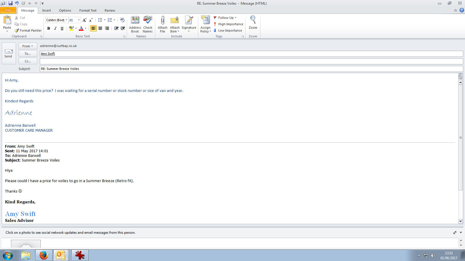 I have not had a response from Amy, I have sent her another message asking if this price is still required and confirming that I am awaiting information from her