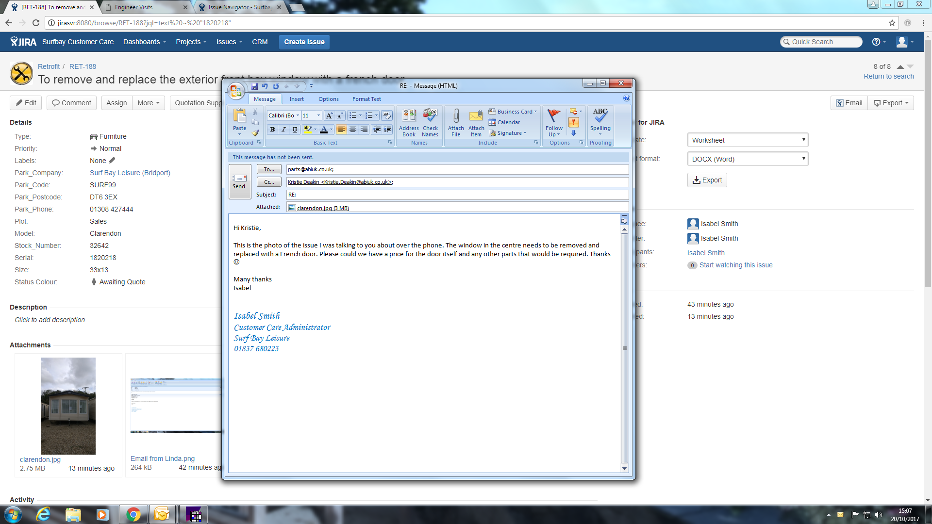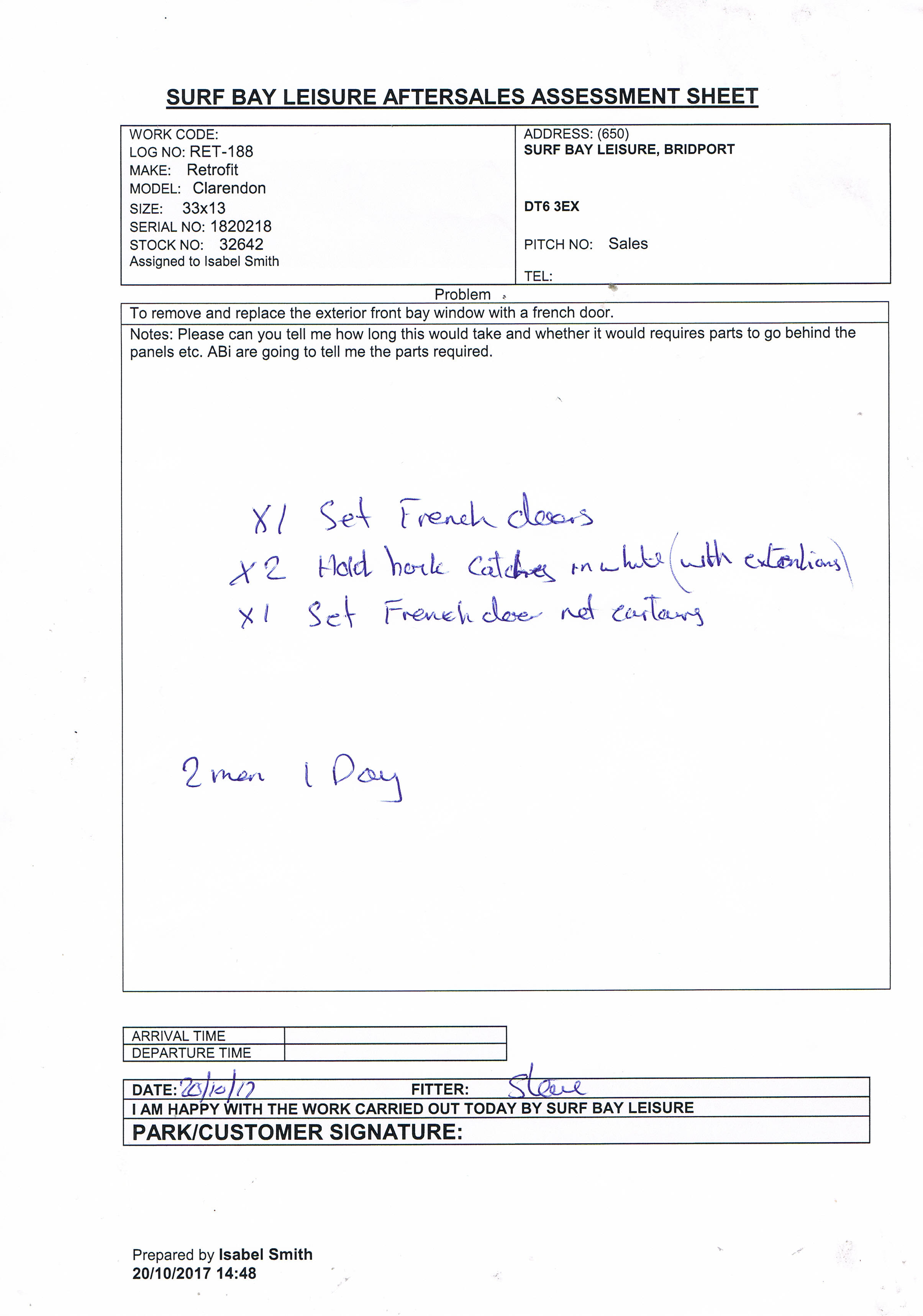 Isabel Smith (Inactive) added a comment - The replacement is just removing the below panels and putting the door in. Emailed Kristie the photo of the caravan. The first photo is the caravan at Bridport and the second one is of the caravan we have here at winkleigh! I have given to Steve and he is going to add his notes so I can get the quote sent across next week. I have also emailed kristie asking for the prices of the parts required.