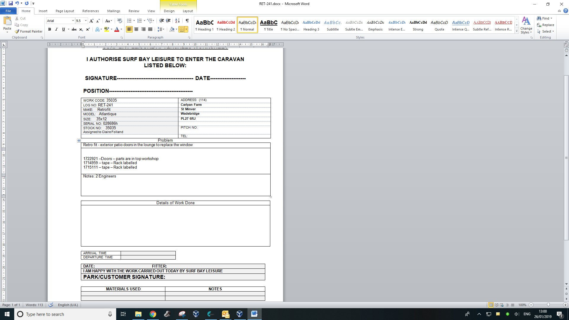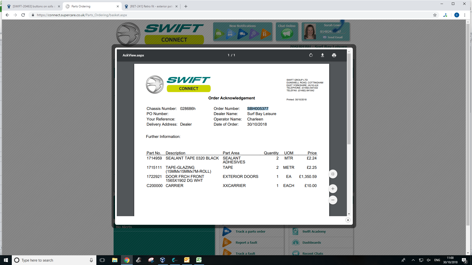 1722921 -Doors 1714959 - tape 1715111 - tape Booked parts against van but still need to do labour when we complete the job. |