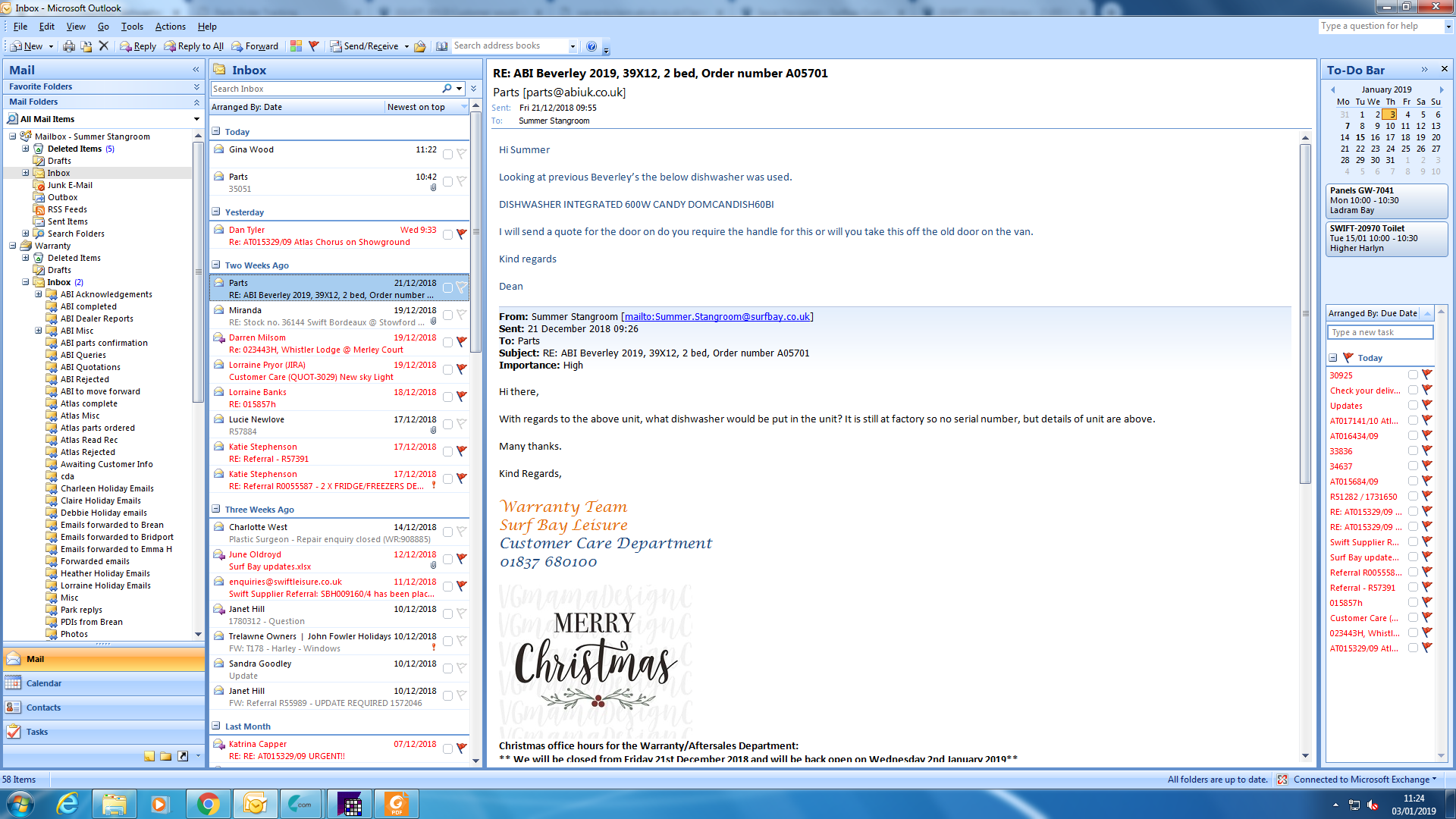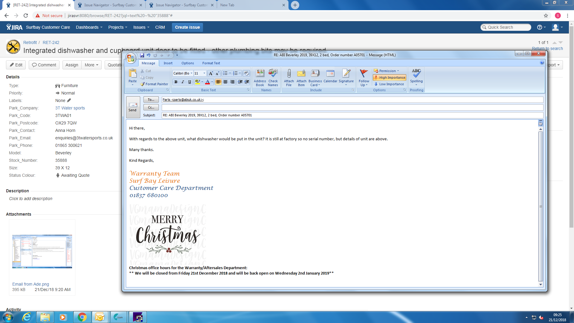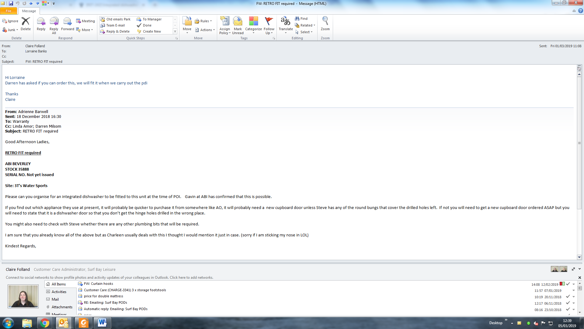 Lorraine Pryor (Inactive) added a comment - RET-242 3-t'S Water Sports - Retro fit Dishwasher stock 35046 s/No 028958H I am going through some costings against new units and can see that the cost of a dishwasher door has been charged against this unit but not the cost of a dishwasher. Could you take a look at this an update the costs please or let me know that the material cost is correct. Thank you. Adrienne Barwell Sales & Transport Administrative Coordinator Spoken to Duncan as I only order a door for him, now have cost of parts: Handle 4.50, Door for dishwasher 54.00, Dishwasher 378.00 and PP 20.00