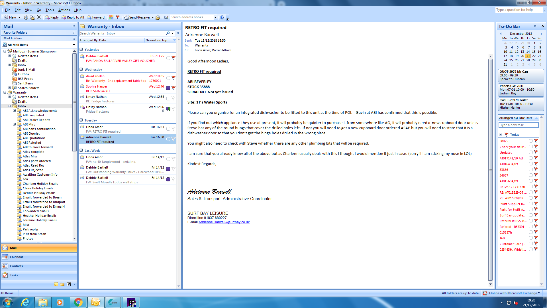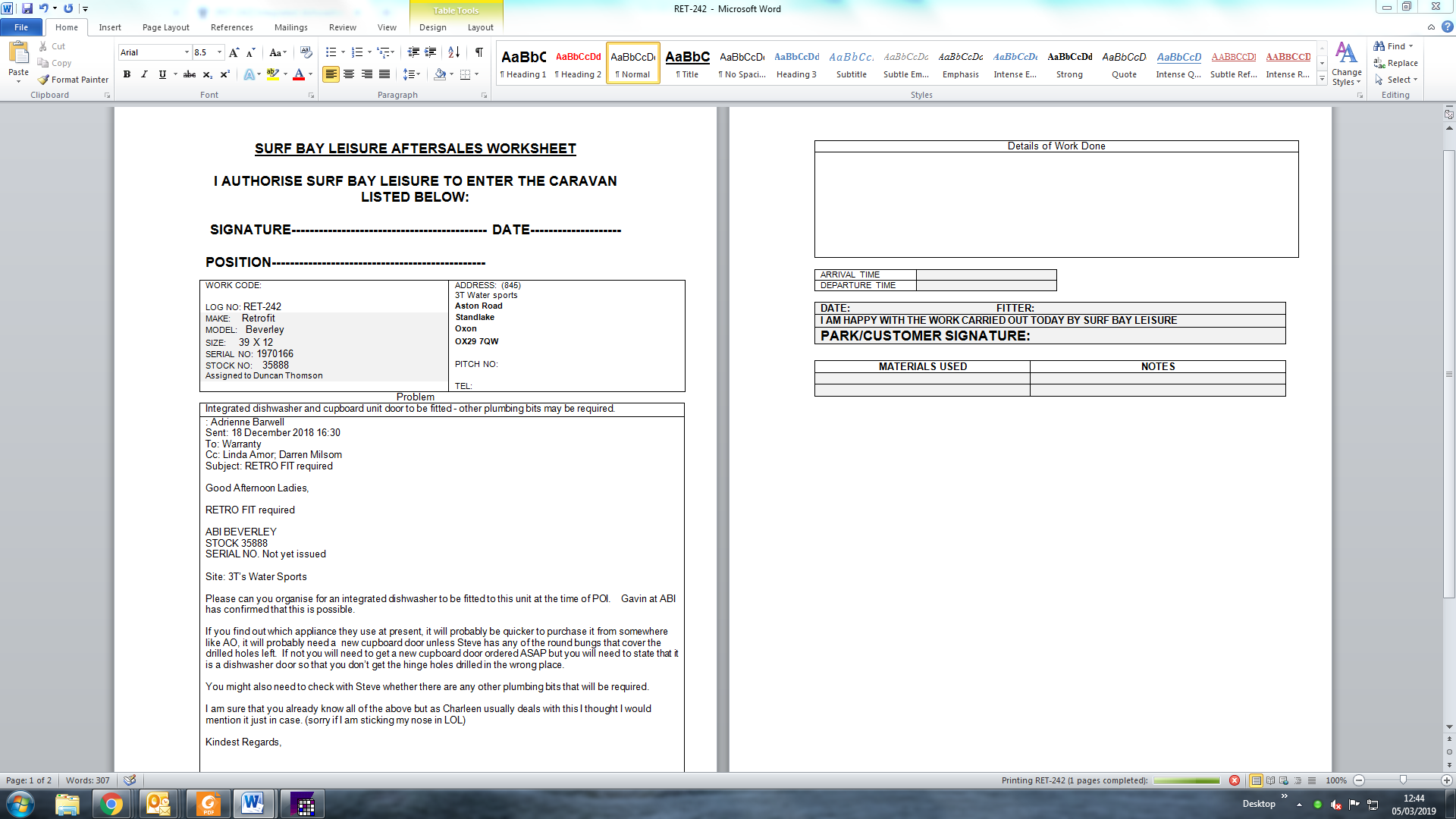 Sent: 18 December 2018 16:30 To: Warranty Cc: Linda Amor; Darren Milsom Subject: RETRO FIT required Good Afternoon Ladies, RETRO FIT required ABI BEVERLEY STOCK 35888 SERIAL NO. Not yet issued Site: 3T’s Water Sports Please can you organise for an integrated dishwasher to be fitted to this unit at the time of POI. Gavin at ABI has confirmed that this is possible. If you find out which appliance they use at present, it will probably be quicker to purchase it from somewhere like AO, it will probably need a new cupboard door unless Steve has any of the round bungs that cover the drilled holes left. If not you will need to get a new cupboard door ordered ASAP but you will need to state that it is a dishwasher door so that you don’t get the hinge holes drilled in the wrong place. You might also need to check with Steve whether there are any other plumbing bits that will be required. I am sure that you already know all of the above but as Charleen usually deals with this I thought I would mention it just in case. (sorry if I am sticking my nose in LOL) Kindest Regards, |