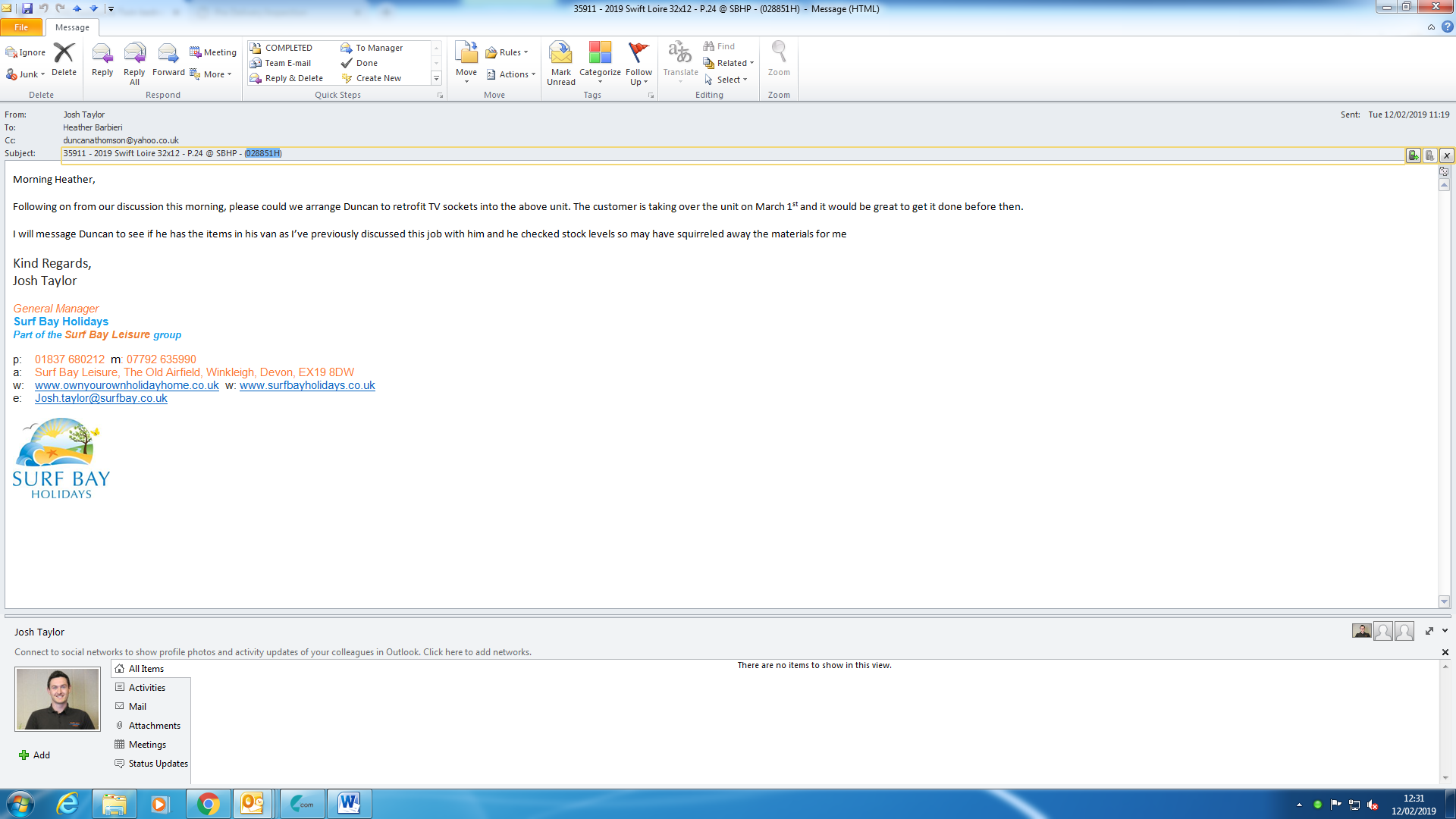 Heather Barbieri (Inactive) added a comment - Josh has asked me to raise this and ask Duncan to fit before 1st march I have spoken to Duncan and he said this will take him a day and the parts are all in stock he will get what he needs I have issued a worksheet and placed in the worksheet folder