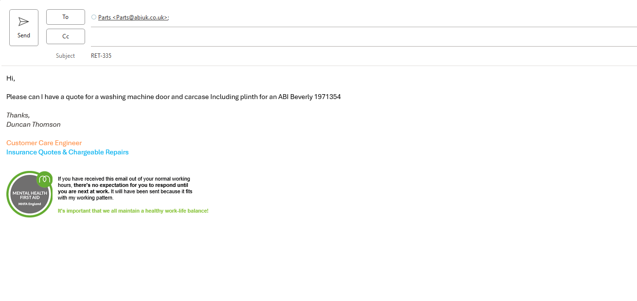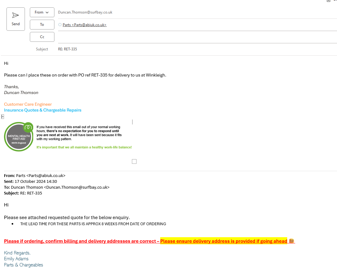 Sent: Wednesday, August 14, 2024 4:10 PM To: Warranty <Warranty@surfbay.co.uk> Subject: Washing Machine Hi Team Parkers Farm have purchased a 2024 ABI Beverley 39 x 12 via Richard Law. Stock number 41364 We have agreed to fit a washing machine when it arrives on site, my understanding is we have removed one from another caravan. I currently do not have a delivery date but wanted you to be aware in case the park calls. Kind regards Chris |