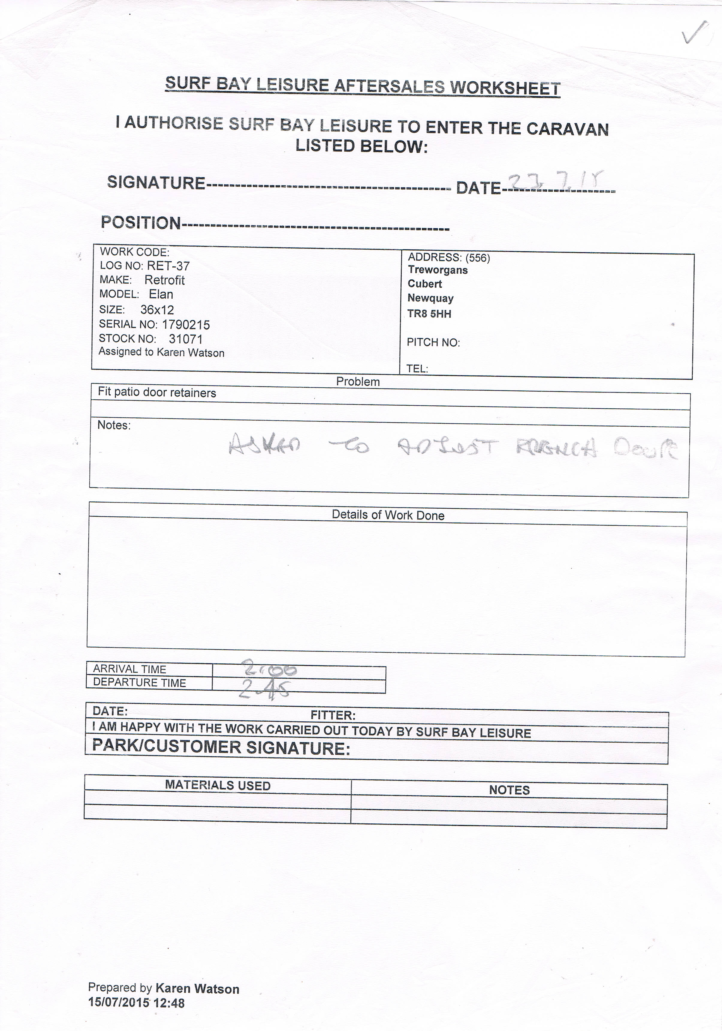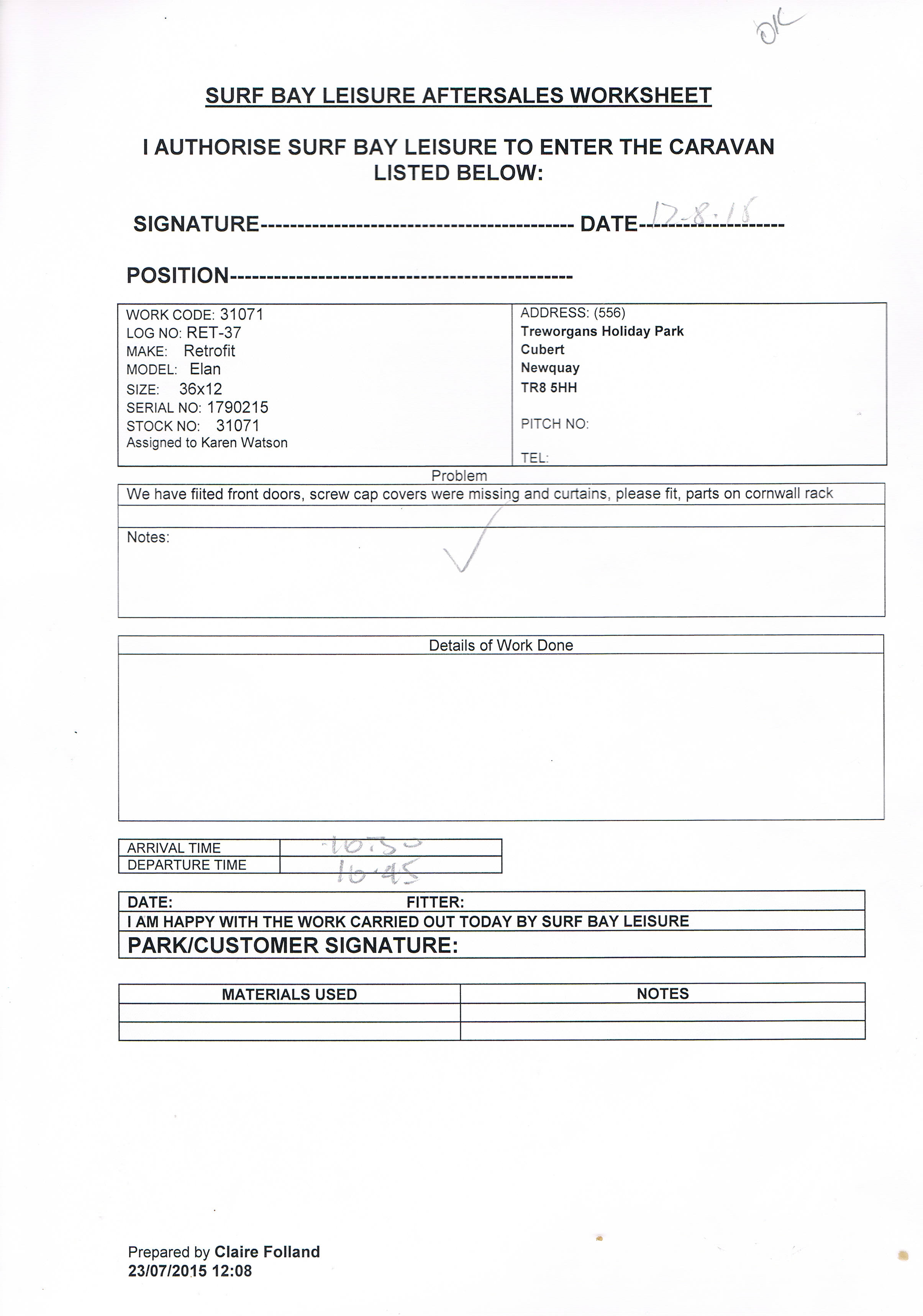 Karen Watson (Inactive) added a comment - Worksheet recieved confirming job is complete.