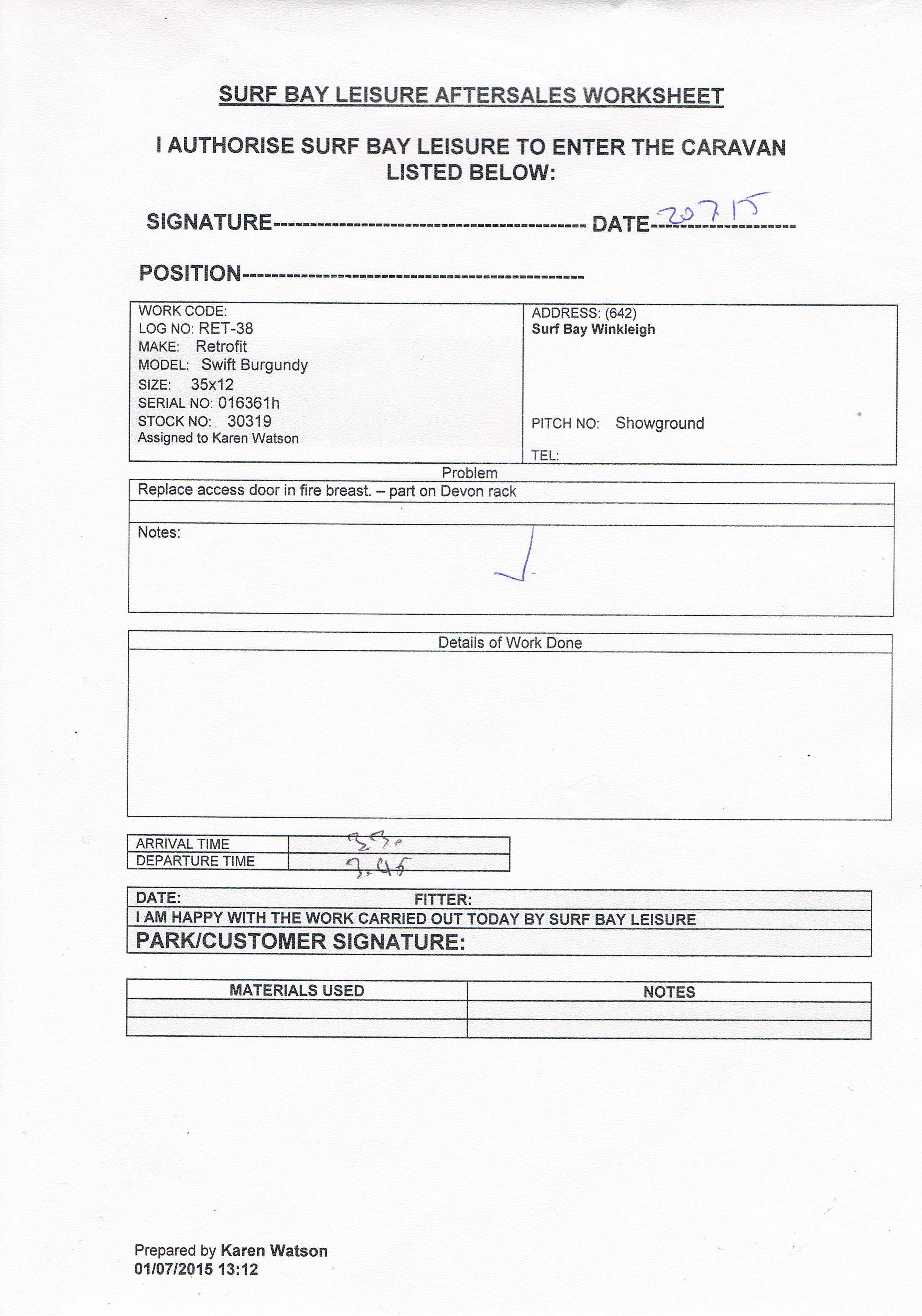Karen Watson (Inactive) added a comment - Assess door received issued worksheet for engineer to do next time in yard. Part in jiffy bag on Devon rack.