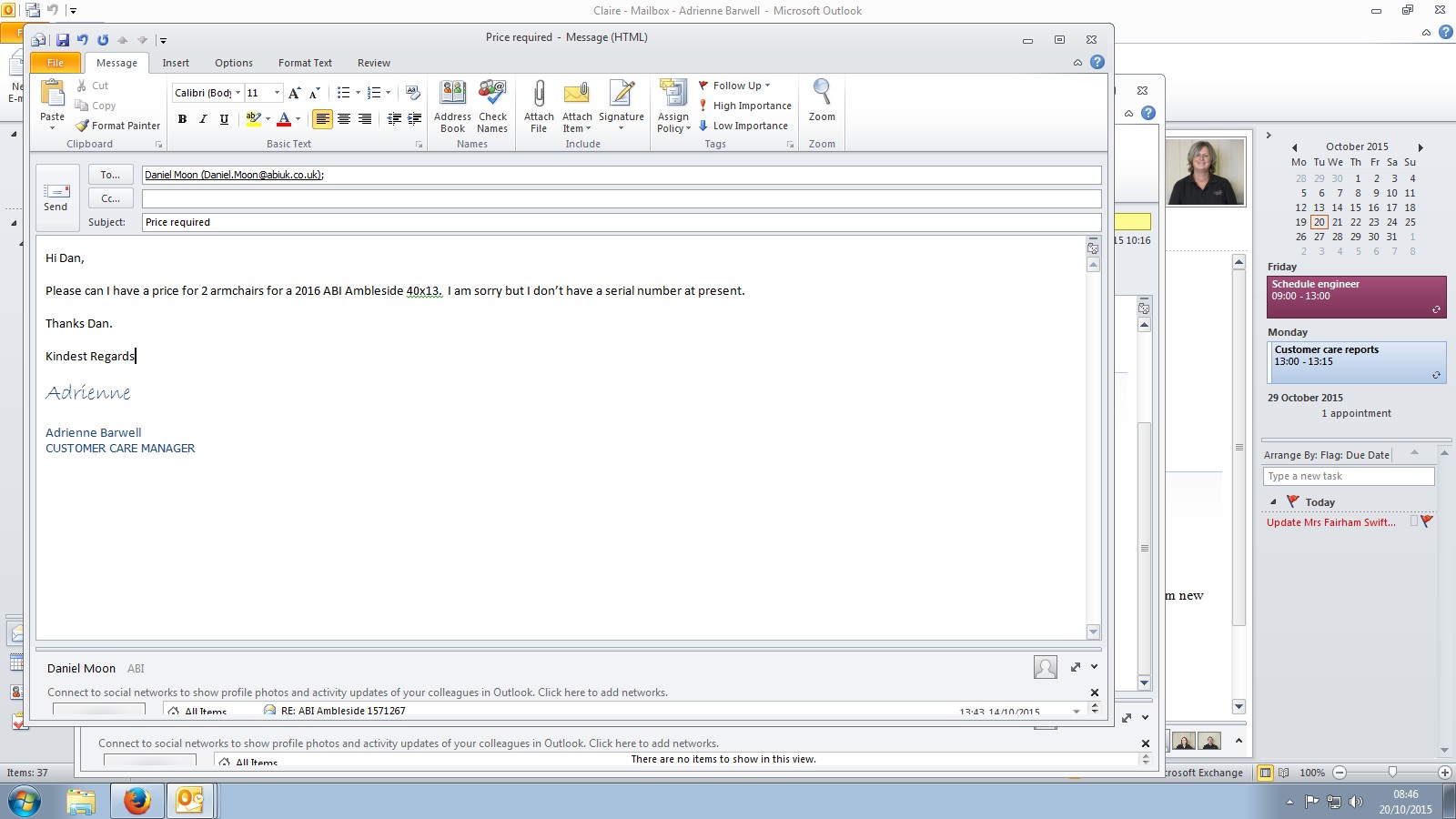 Adrienne Barwell (Inactive) added a comment - Matt phoned chasing the prices, I apologised for the delay, although he sent it to me last week, I was out of the office and only sent this over to Claire yesterday morning. I will give it a chase